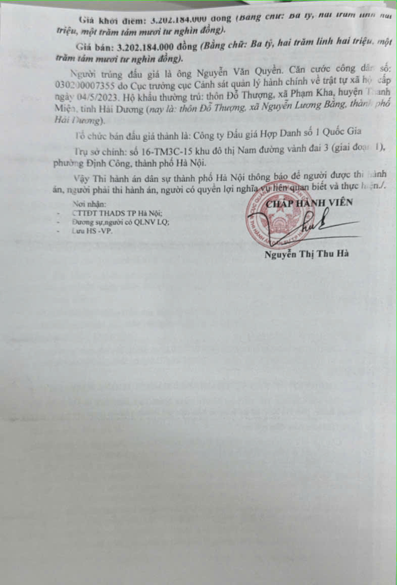 Thông báo về việc lựa chọn tổ chức đấu giá tài sản - Chi cục THADS quận Ba Đình