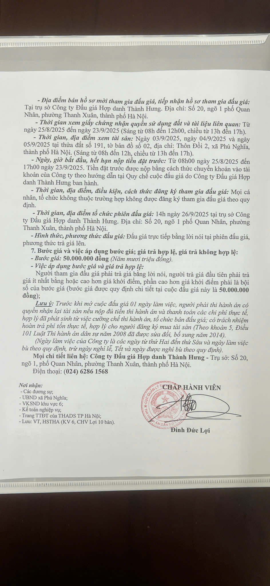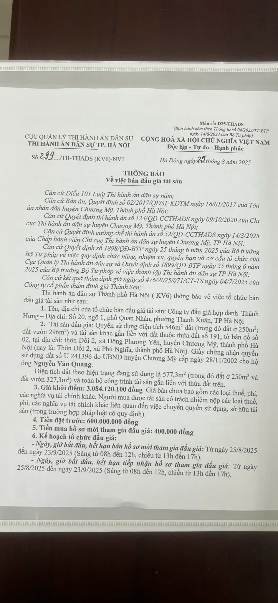 Thông báo bán đấu giá tài sản số 299/TB-THADSKV6 ngày 25/08/2025 của CHV Lợi