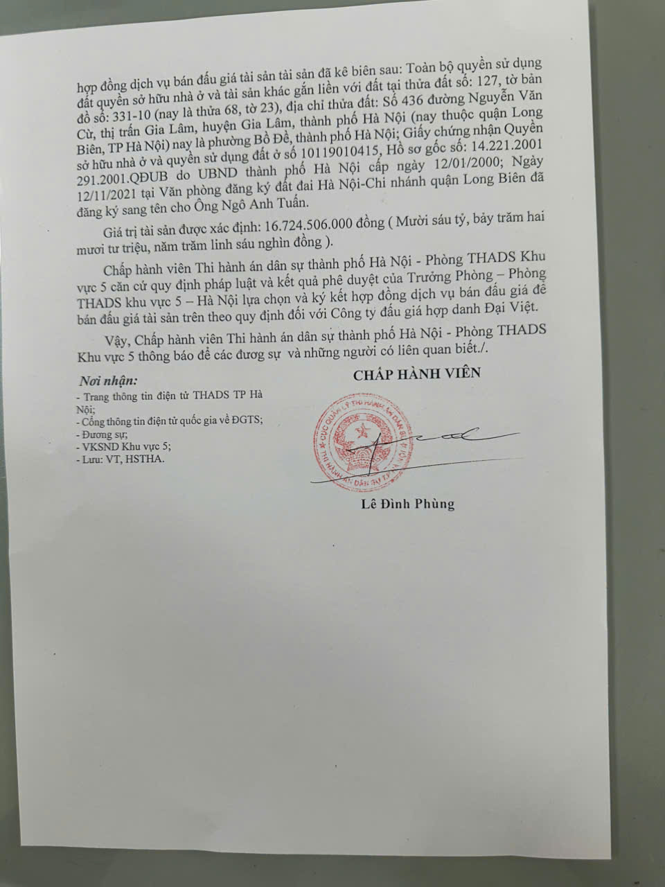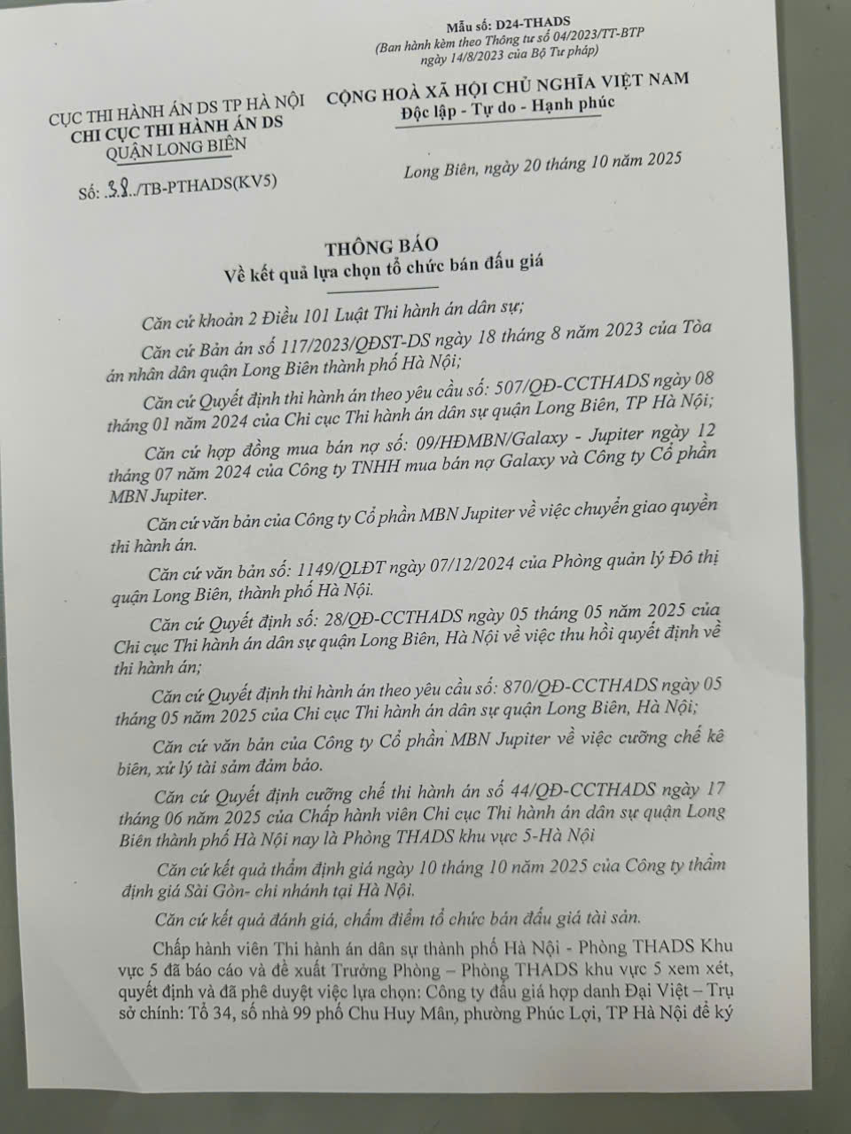 Phòng thi hành án dân sự khu vực 5 - Hà Nội thông báo kết quả lựa chọn tổ chức bán đấu giá tài sản số 39/TB-PTHADS(KV5) ngày 20/10/2025