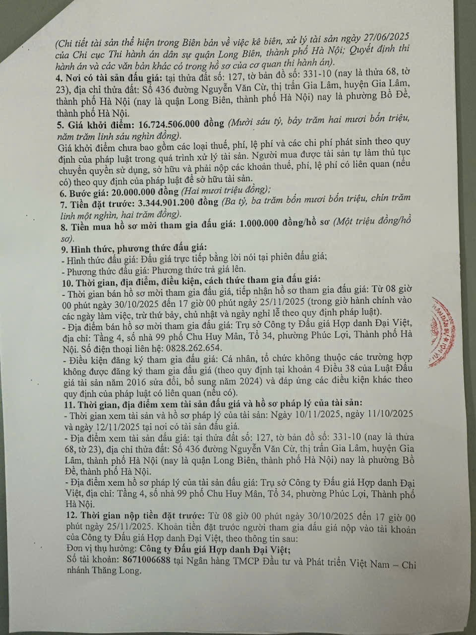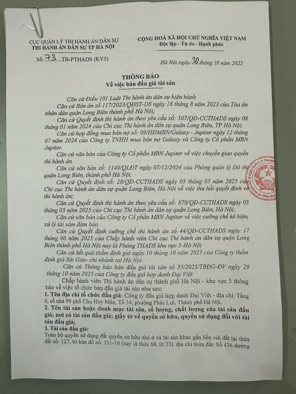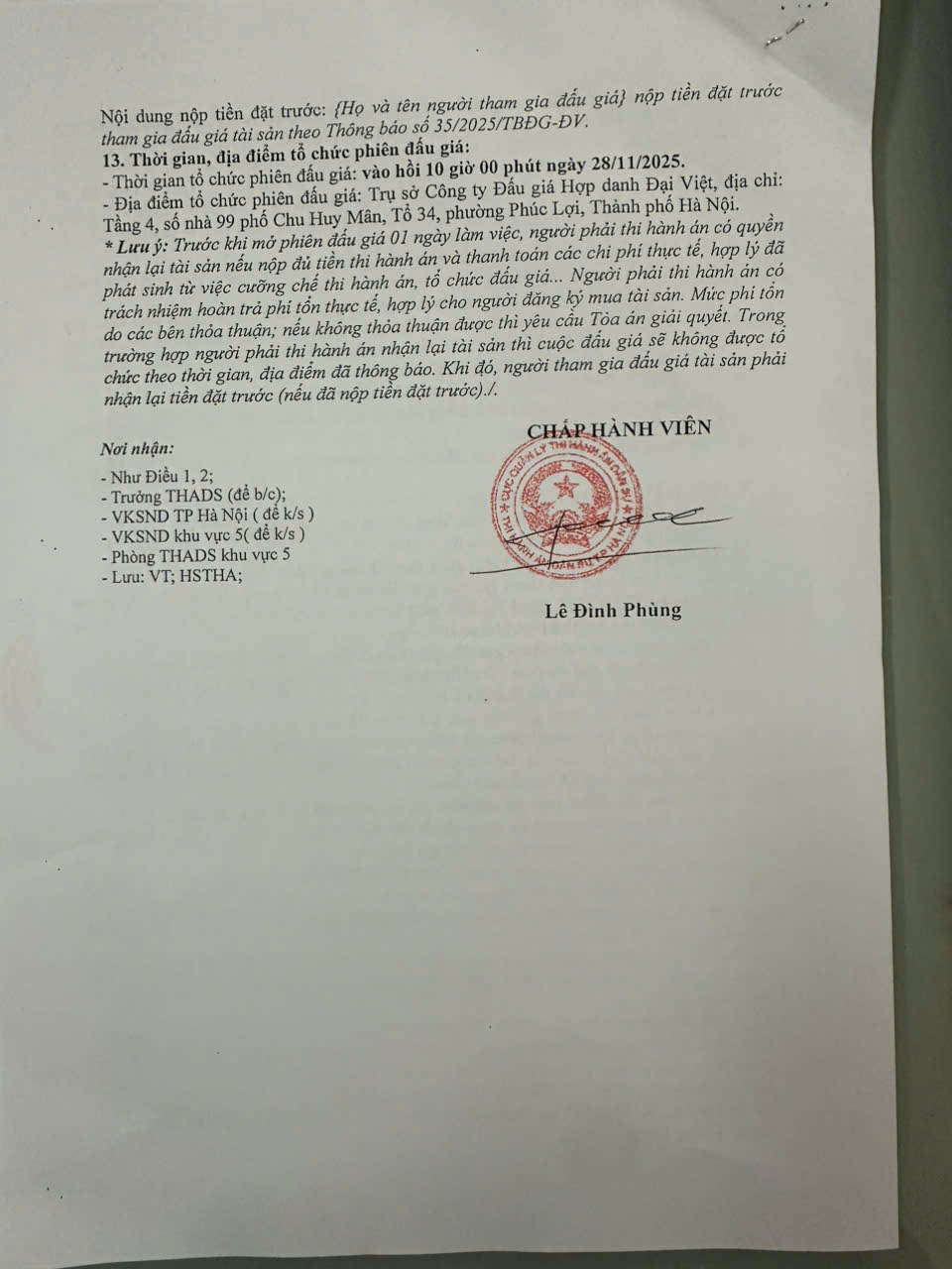 Phòng thi hành án dân sự khu vực 5 - Hà Nội thông báo về việc bán đấu giá tài sản số 73/TB-PTHADS(KV5) ngày 30/10/2025