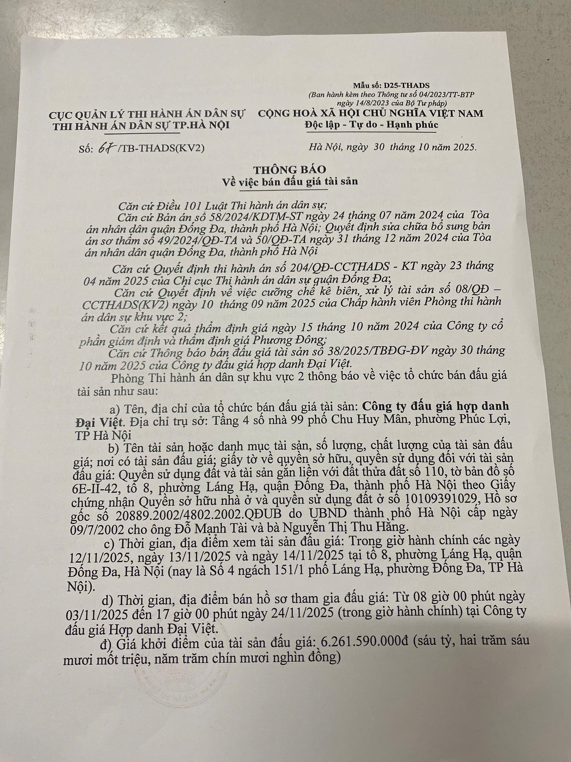 Phòng Thi hành án dân sự Khu vực 2 Thông báo Về việc bán đấu giá tài sản Số 67/TB - THADS (KV2) ngày 30 /10/2025