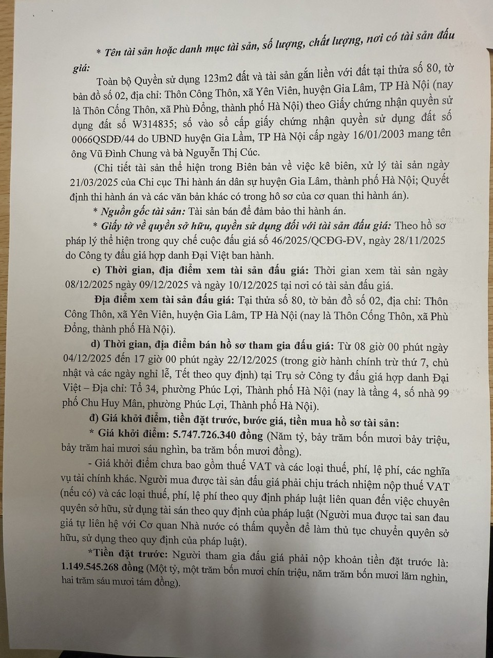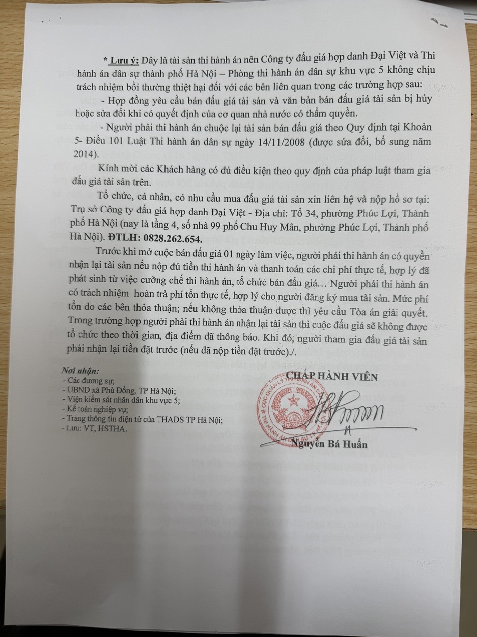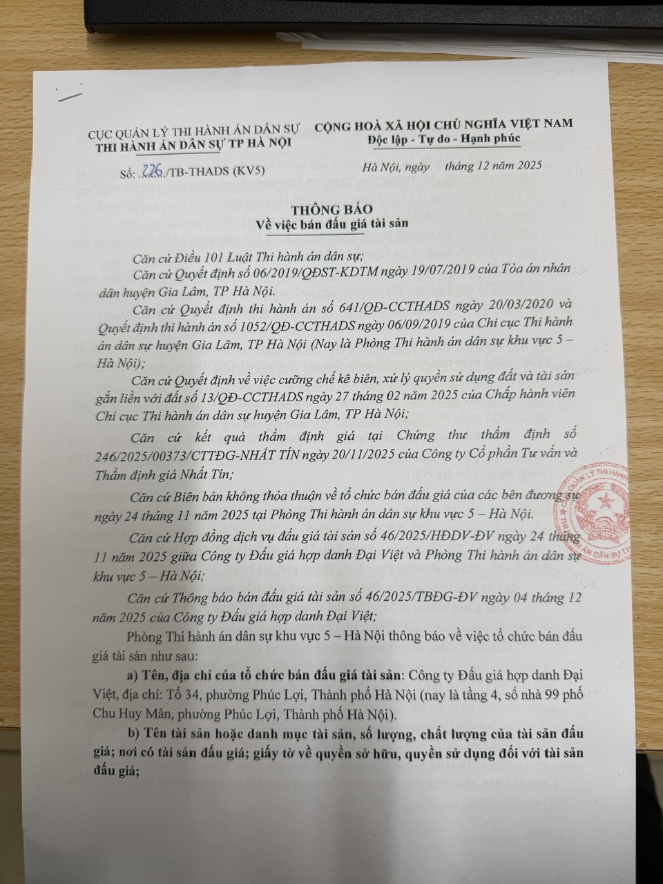 Thông báo số 226/TB-THADS (KV5) vv bán đấu giá tài sản