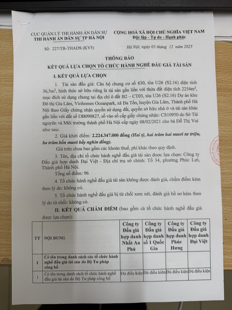 Thông báo số 227/TB-THADS (KV5) ngày 05/12/2025 vv Thông báo kết quả lựa chọn tổ chức đấu giá tài sản
