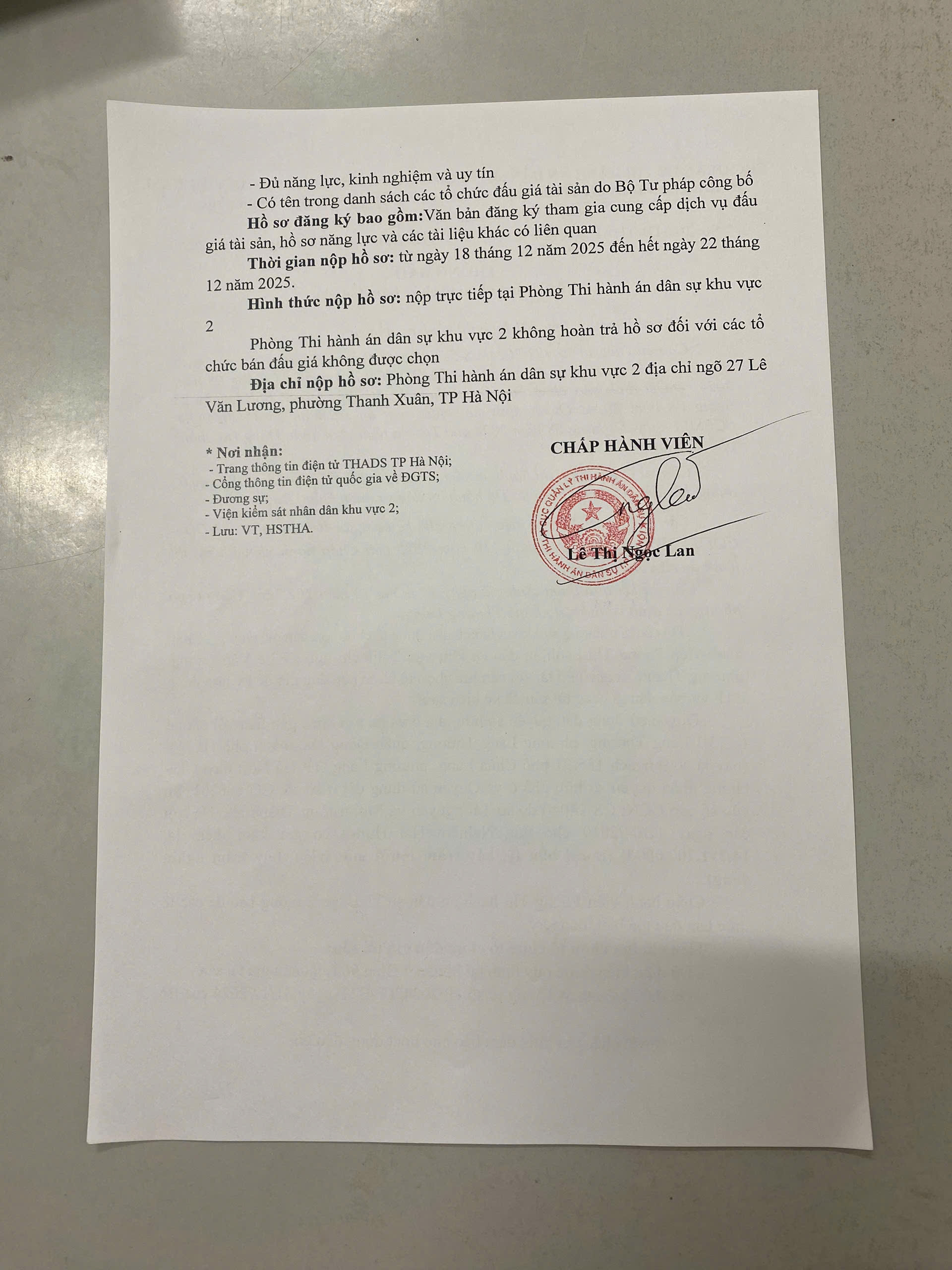 Phòng Thi hành án dân sự Khu vực 2, TP Hà Nội, Thông báo về việc lựa chọn tổ chức bán đấu giá số 208/TB - THADS (KV2) ngày 18/12/2025