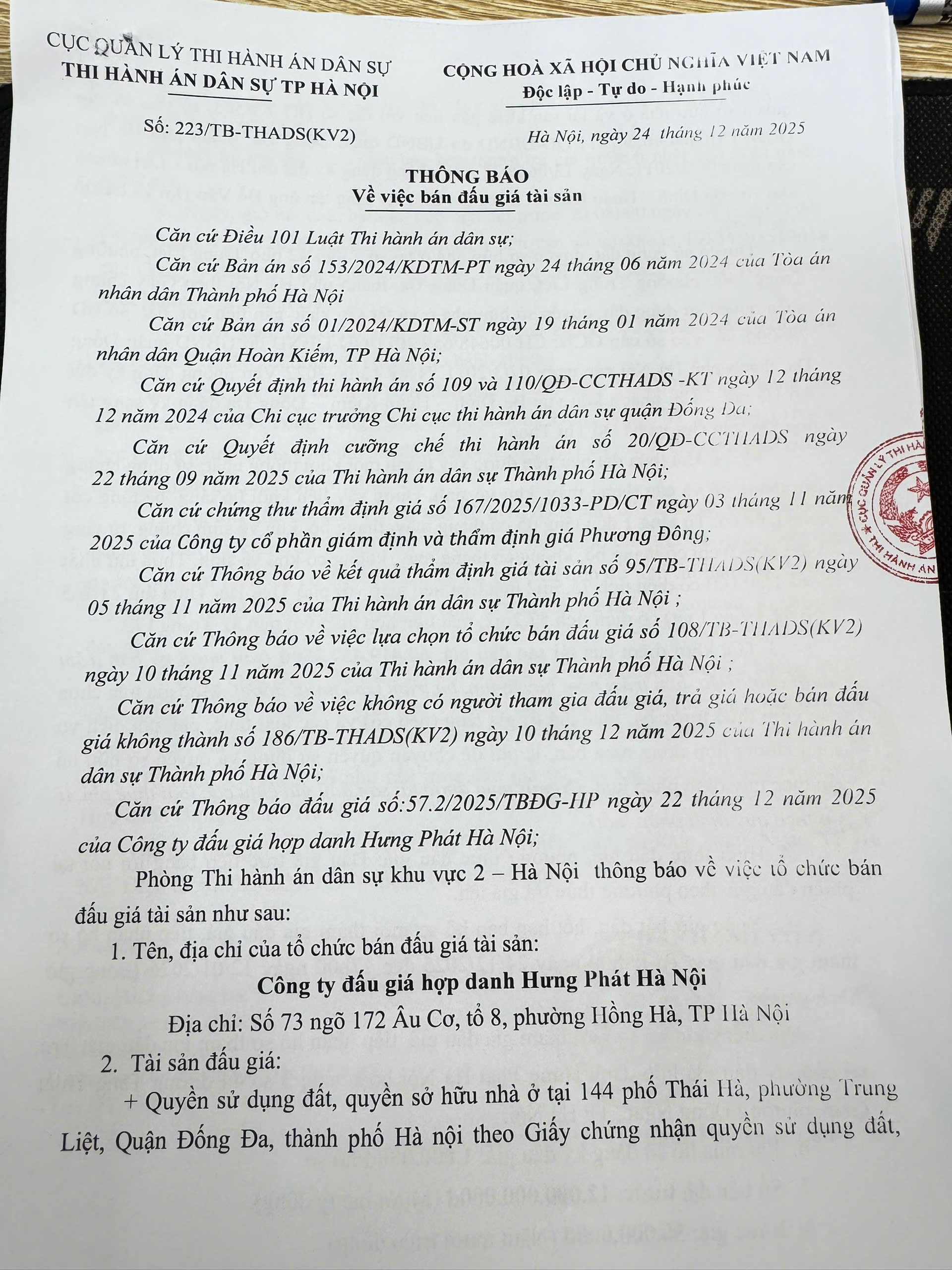 Phòng thi hành án dân sự khu vực 2-Hà Nội thông báo số 223/TB ngày 24.12.2025 về việc bán đấu giá tài sản