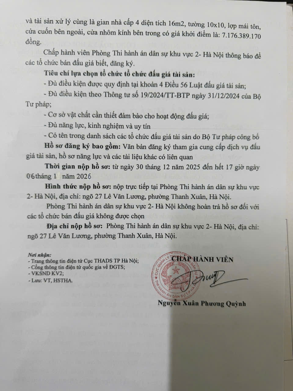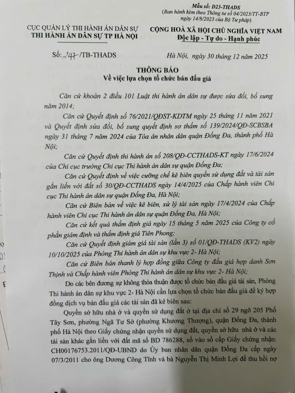 Phòng Thi hành án dân sự khu vực 2, TP Hà Nội thông báo về việc lựa chọn tổ chức bán đấu giá số 247/TB - THADS ngày 30/12/2025