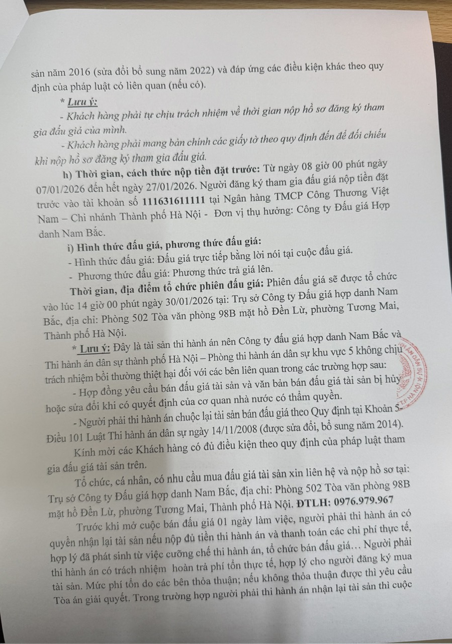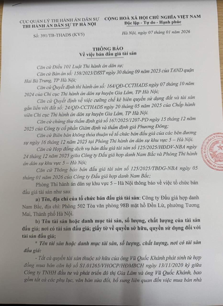 Phòng THADS KV5 thông báo vv bán đấu giá tài sản số 391/TB-THADS (KV5) ngày 08/01/2026