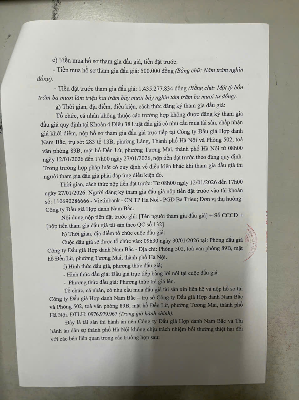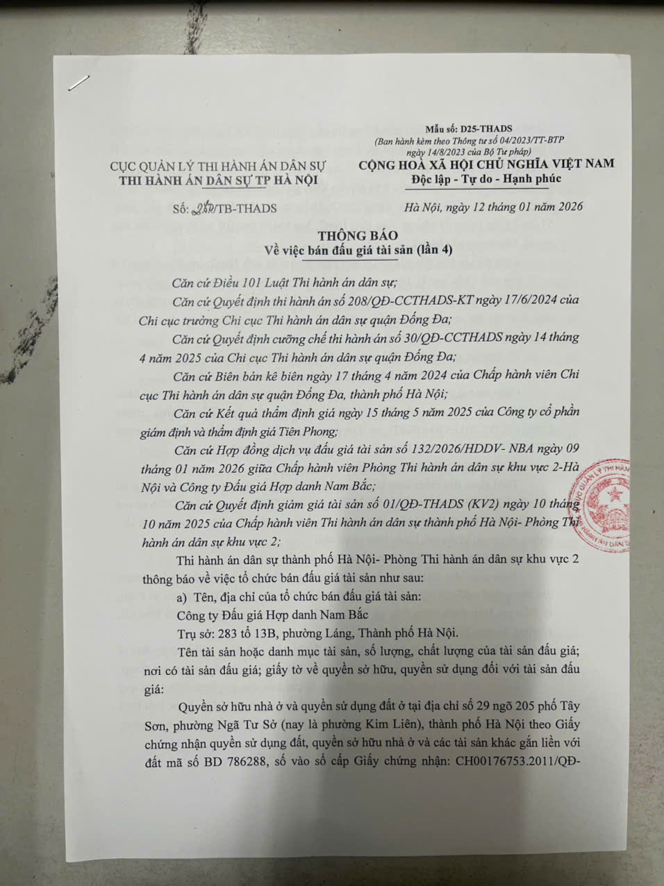 Phòng Thi hành án dân sự Khu vực 2, TP Hà Nội Thông báo về việc bán đấu giá tài sản (lần 4) số 280/TB - THADS ngày 12/1/2026