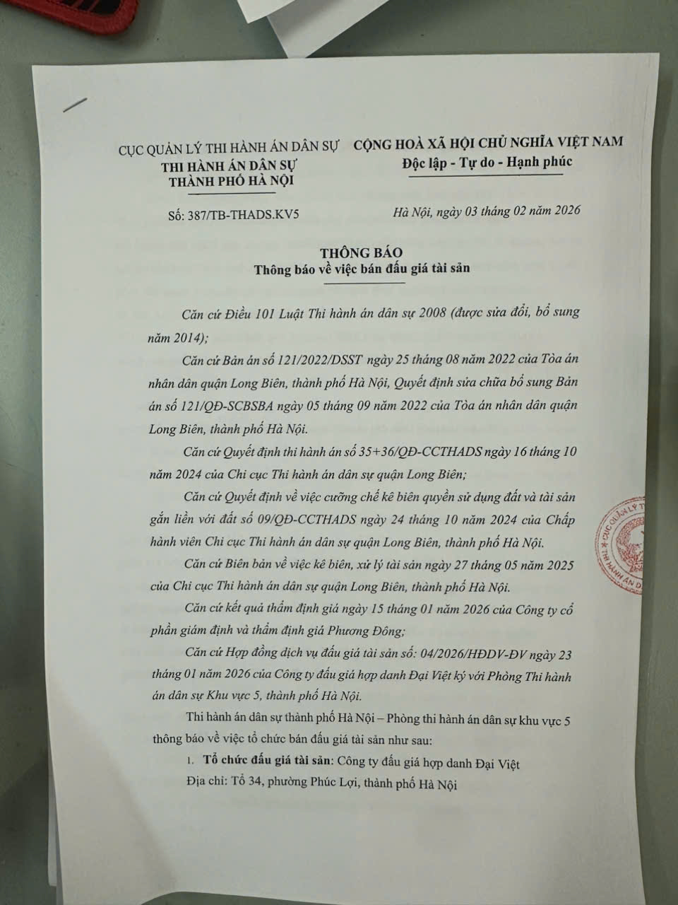 Phòng thi hành án dân sự khu vực 5 - Hà Nội thông báo về việc bán đấu giá tài sản số 387/TB-THADS.KV5 ngày 03/2/2026