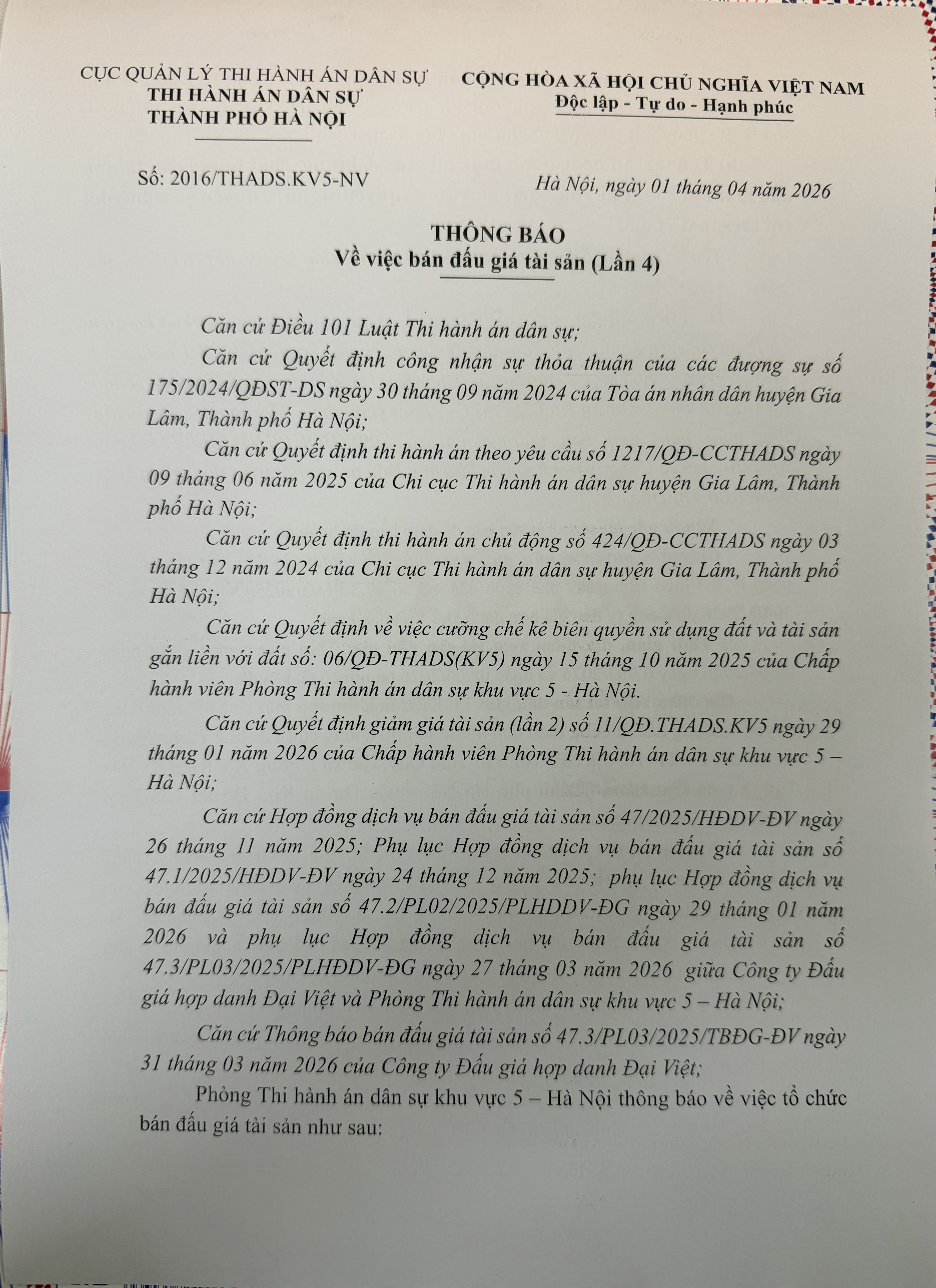 Phòng Thi hành án dân sự khu vực 5 - Hà Nội thông báo về việc bán đấu giá tài sản (Lần 4) số 2016/THADS.KV5-NV ngày 01/04/2026