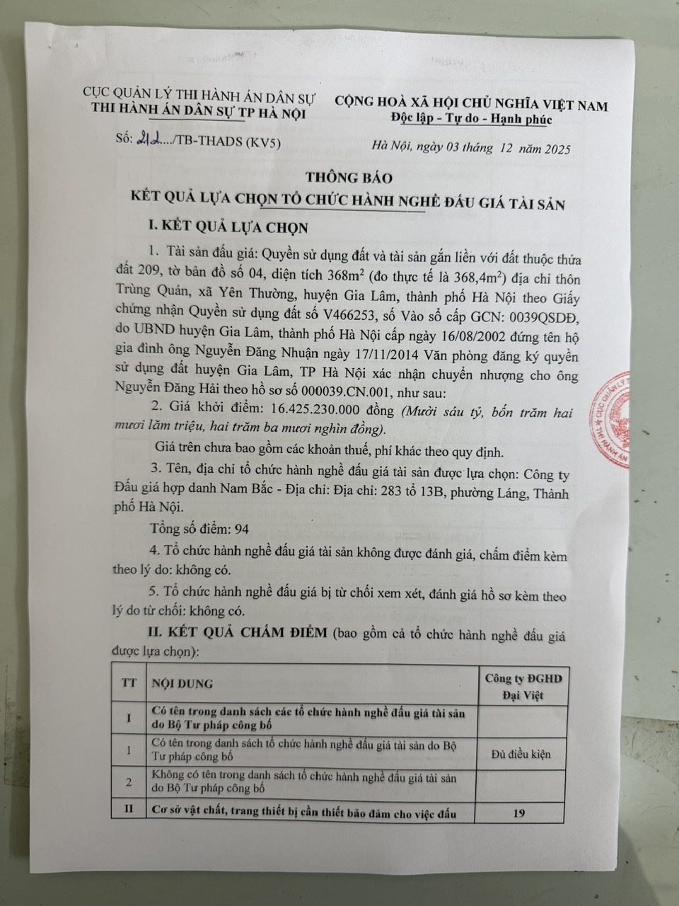 Thông báo về việc lựa chọn tổ chức đấu giá tài sản - Chi cục THADS quận Ba Đình