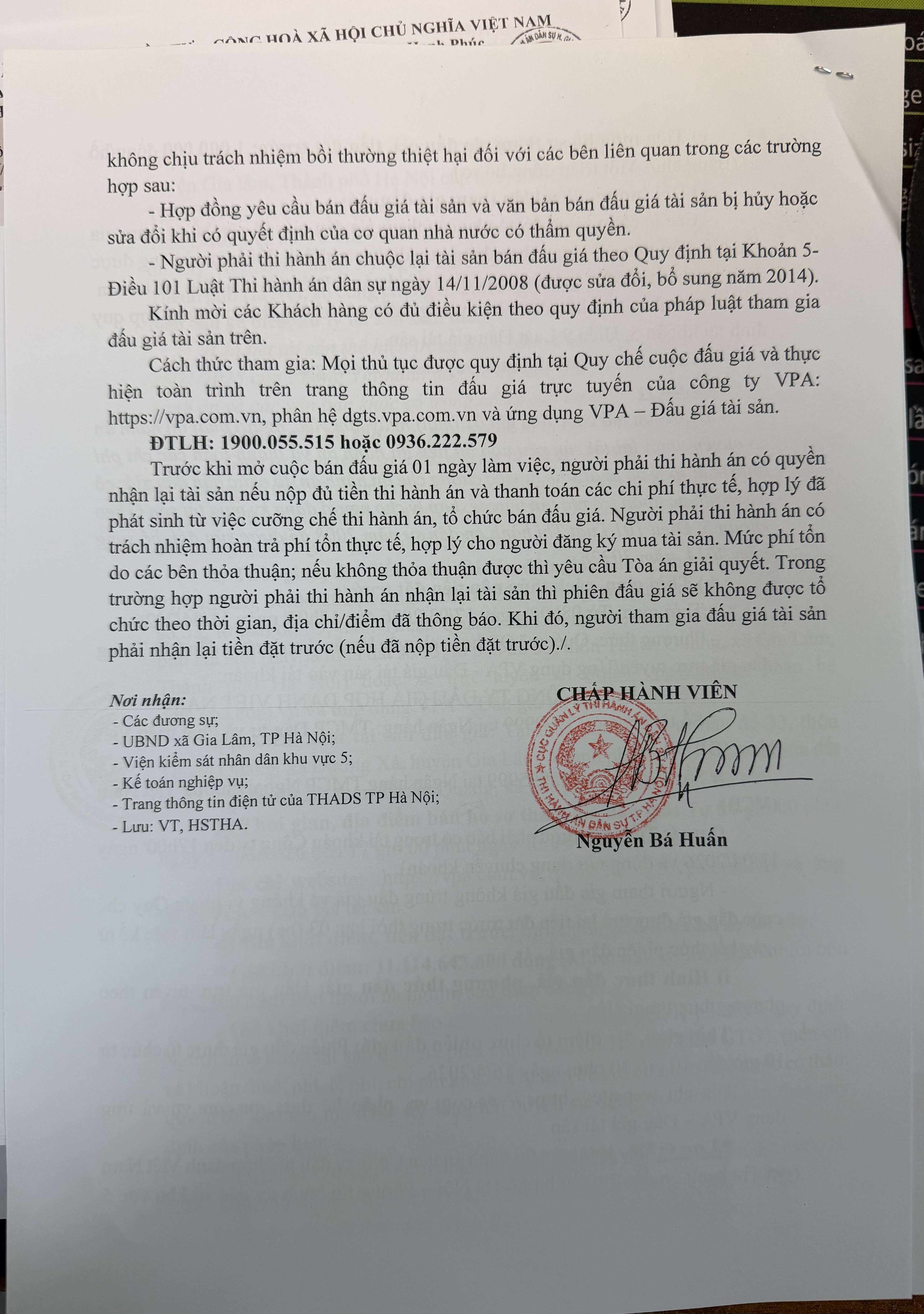 Thông báo số 257/TB-CCTHADS ngày 01/8/2017 của Chi cục THADS quận Nam Từ Liêm về lựa chọn tổ chức bán đấu giá tài sản