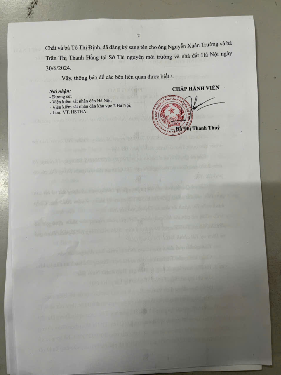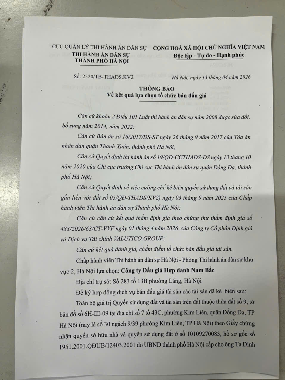Phòng Thi hành án dân sự Khu vực 2, Hà Nội Thông báo số 2520/TB - THADS (KV2) ngày 13/4/2026 về kết quả lựa chọn tổ chức bán đấu giá