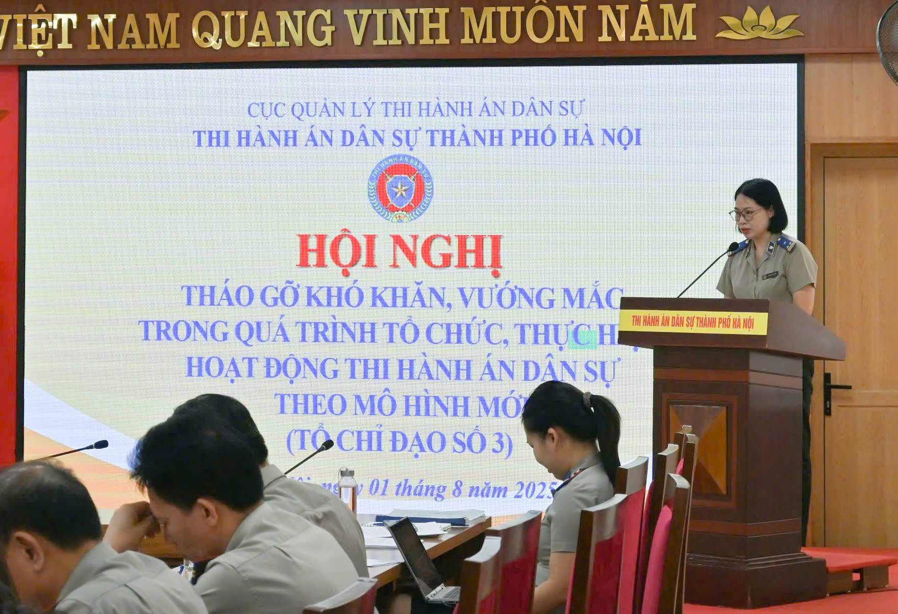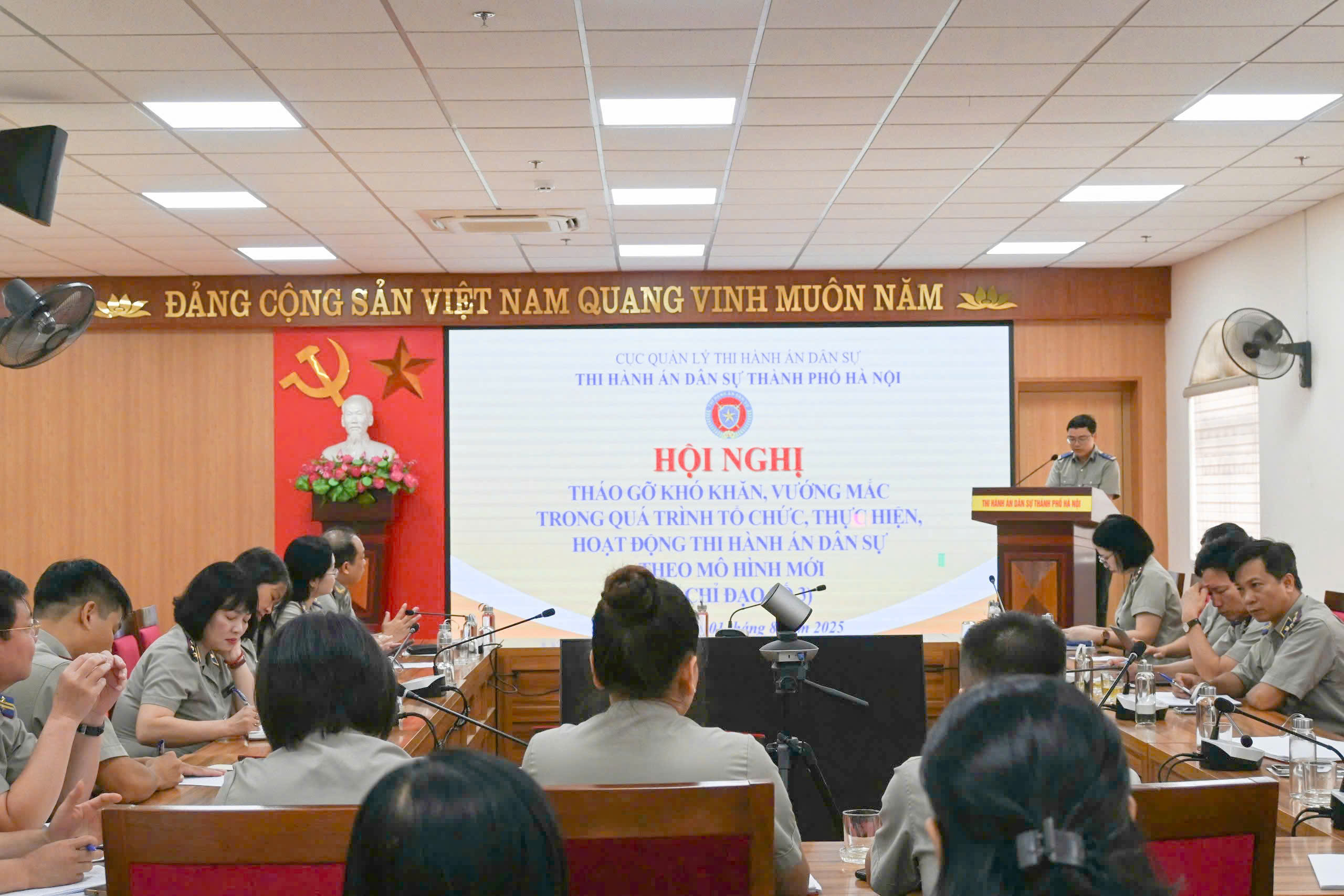 Hội nghị do đồng chí Trần Quốc Thái – Phó trưởng Cục THADS thành phố Hà Nội chủ trì. Phát biểu khai mạc, đồng chí nhấn mạnh ý nghĩa quan trọng của việc kiện toàn tổ chức bộ máy và việc vận hành các công việc. Ngày 14/7/2025, Trưởng THADS thành phố Hà Nội đã ký ban hành Quyết định số 13/QĐ-THADS về việc lập 4 tổ chỉ đạo tháo gỡ khó khăn, vướng mắc trong qua trình tổ chức, thực hiện, hoạt động THADS theo mô hình mới. Tổ chỉ đạo số 3 thực hiện theo dõi, chỉ đạo giải quyết những khó khăn, vướng mắc trong công tác giải quyết khiếu nại, tố cáo; kiến nghị, kháng nghị của Viện kiểm sát nhân dân; kiến nghị, xin ý kiến chỉ đạo của cấp trên và các văn bản khác có liên quan đến khiếu nại, tố cáo, kiến nghị, kháng nghị, và các nhiệm vụ khác theo Quyết định số 04/QĐ-THADS ngày 09/7/2025 của Trưởng THADS thành phố Hà Nội. Trong đó có tập trung vào giải đáp những khó vướng mắc trong việc thực hiện Quy trình tiếp công dân và Quy trình giải quyết khiếu nại, tố cáo (ban hành kèm theo Quyết định số 630/QĐ-TCTHADS ngày 26/6/2025 của Tổng cục THADS), qua đó tạo tiền đề nâng cao hiệu quả công tác thi hành án dân sự trên địa bàn Thủ đô.