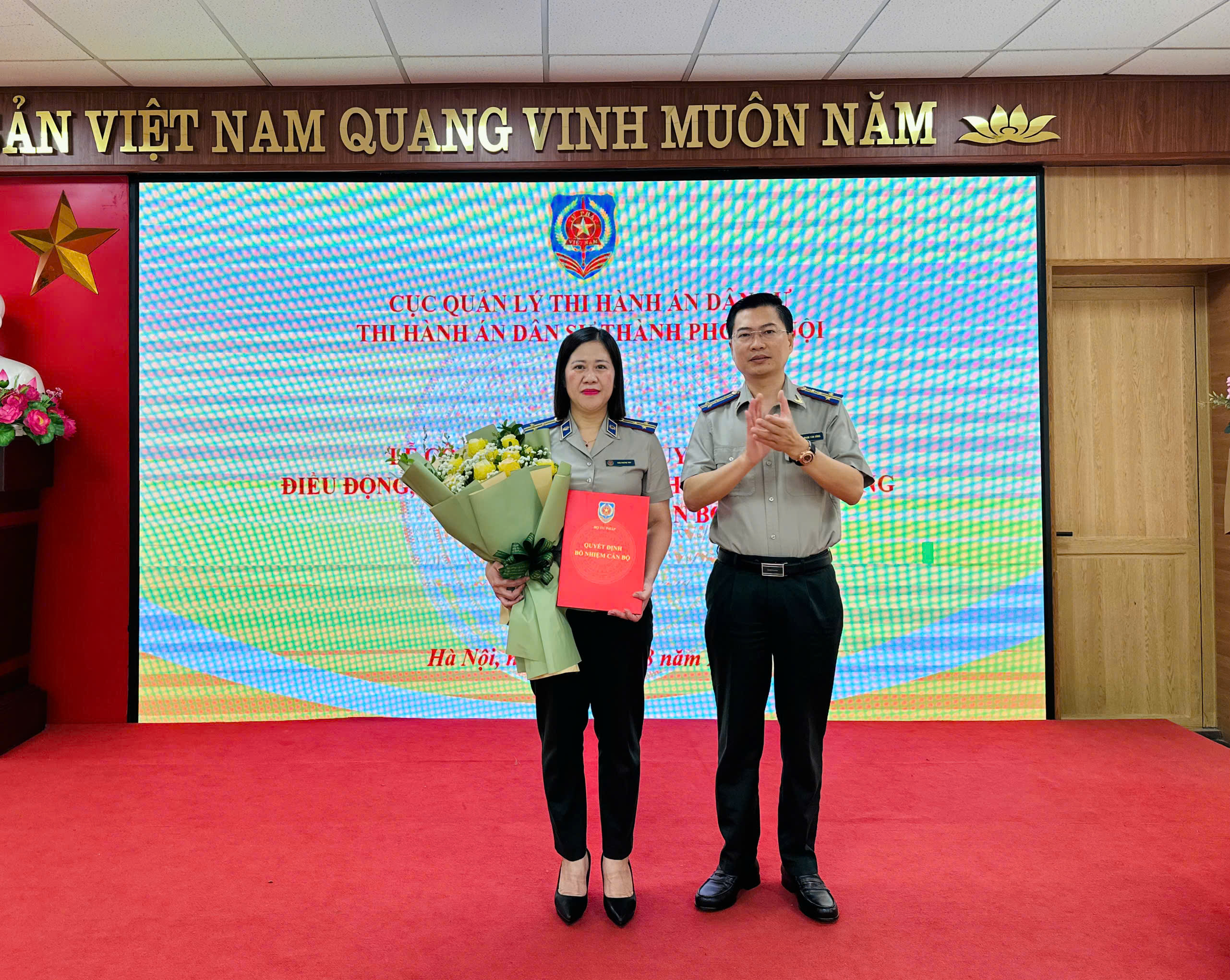 Đồng chí Phạm Văn Dũng - Bí thư Đảng ủy, Trưởng Thi hành án dân sự thành phố Hà Nội trao Quyết định và tặng hoa chúc mừng đồng chí Trần Phương Thúy – Phó Trưởng phòng Phòng Tổ chức cán bộ