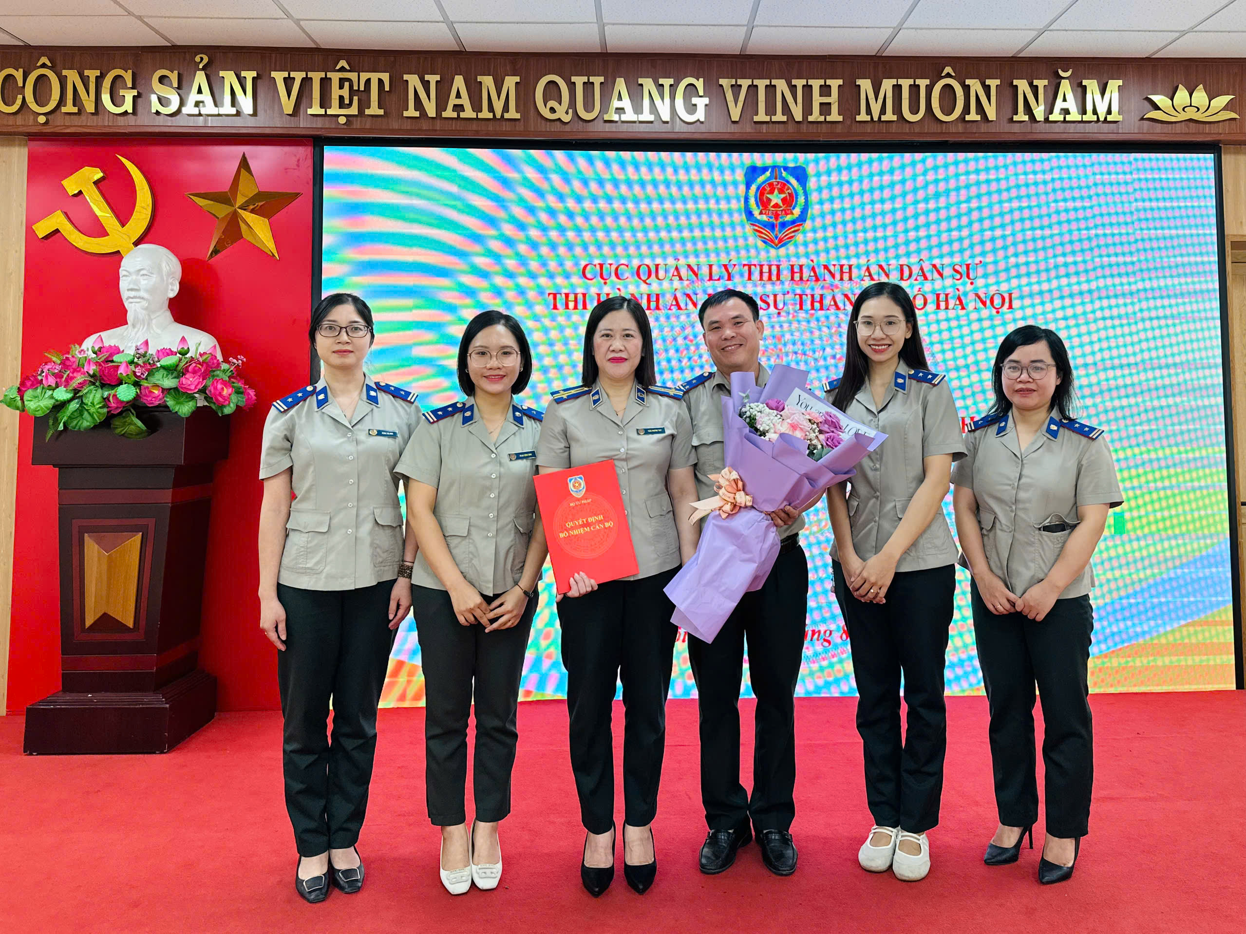 Các đồng chí Lãnh đạo Thi hành án dân sự thành phố Hà Nội chụp ảnh lưu niệm cùng đồng chí Trần Phương Thúy – Phó Trưởng phòng Phòng Tổ chức cán bộ