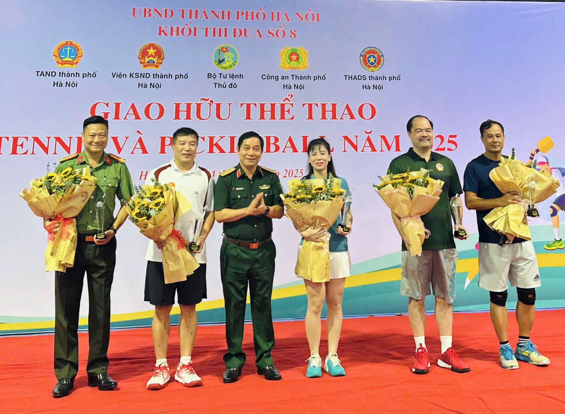 Thiếu tướng Nguyễn Khắc Nhân – Phó Chính ủy Bộ Tư lệnh Thủ đô Hà Nội trao cúp và tặng hoa cho đại diện 05 đơn vị tham gia môn Pickleball