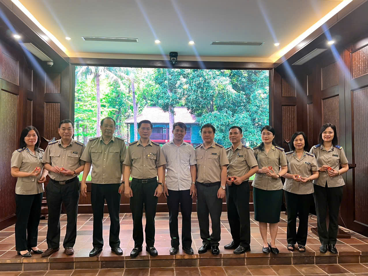 Đại diện Lãnh đạo Khu di tích Chủ tịch Hồ Chí Minh tại Phủ Chủ tịch tặng huy hiệu lưu niệm cho các đ/c Lãnh đạo Cục và Trưởng cá phòng chuyên môn - Ảnh: PT
