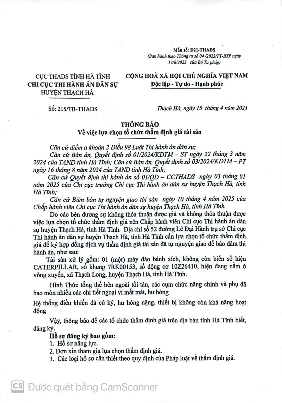 TB số 1144/TB-THADS, ngày 15/10/2021 của Cục THADS tỉnh Hà Tĩnh (CHV Lê Văn Sơn) về lựa chọn tổ chức thẩm định giá tài sản thi hành án gồm: 01 chiếu máy đào xích; 01 búa đục thủy lực