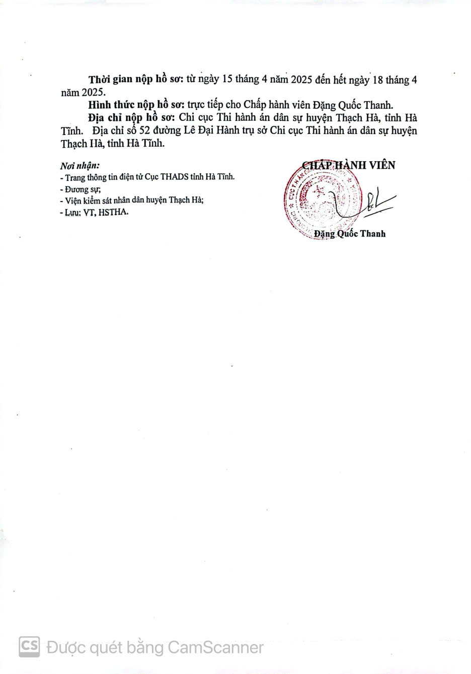 CHI CỤC THI HÀNH ÁN DÂN SỰ HUYỆN THẠCH HÀ TB Số: 215/TB-THADS (15/4/2025)
