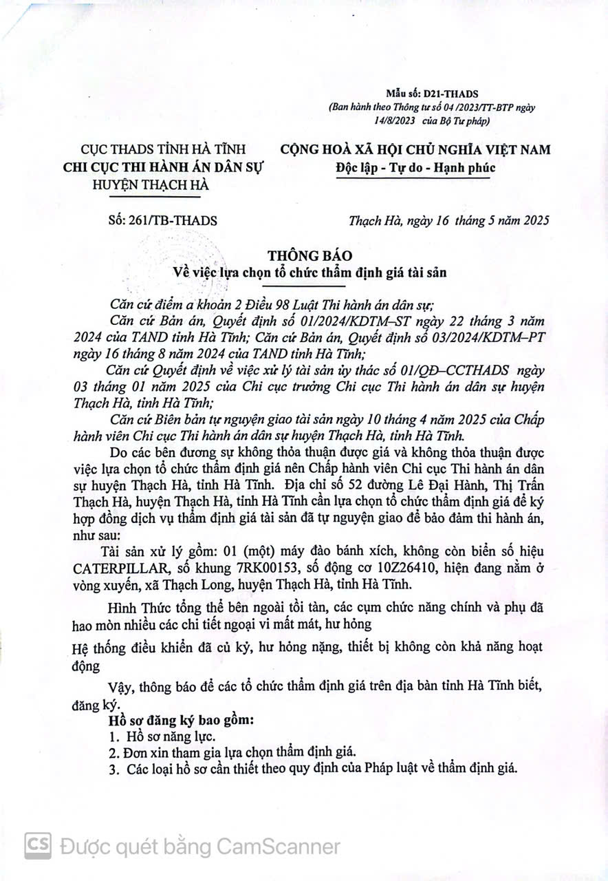 TB số 1144/TB-THADS, ngày 15/10/2021 của Cục THADS tỉnh Hà Tĩnh (CHV Lê Văn Sơn) về lựa chọn tổ chức thẩm định giá tài sản thi hành án gồm: 01 chiếu máy đào xích; 01 búa đục thủy lực