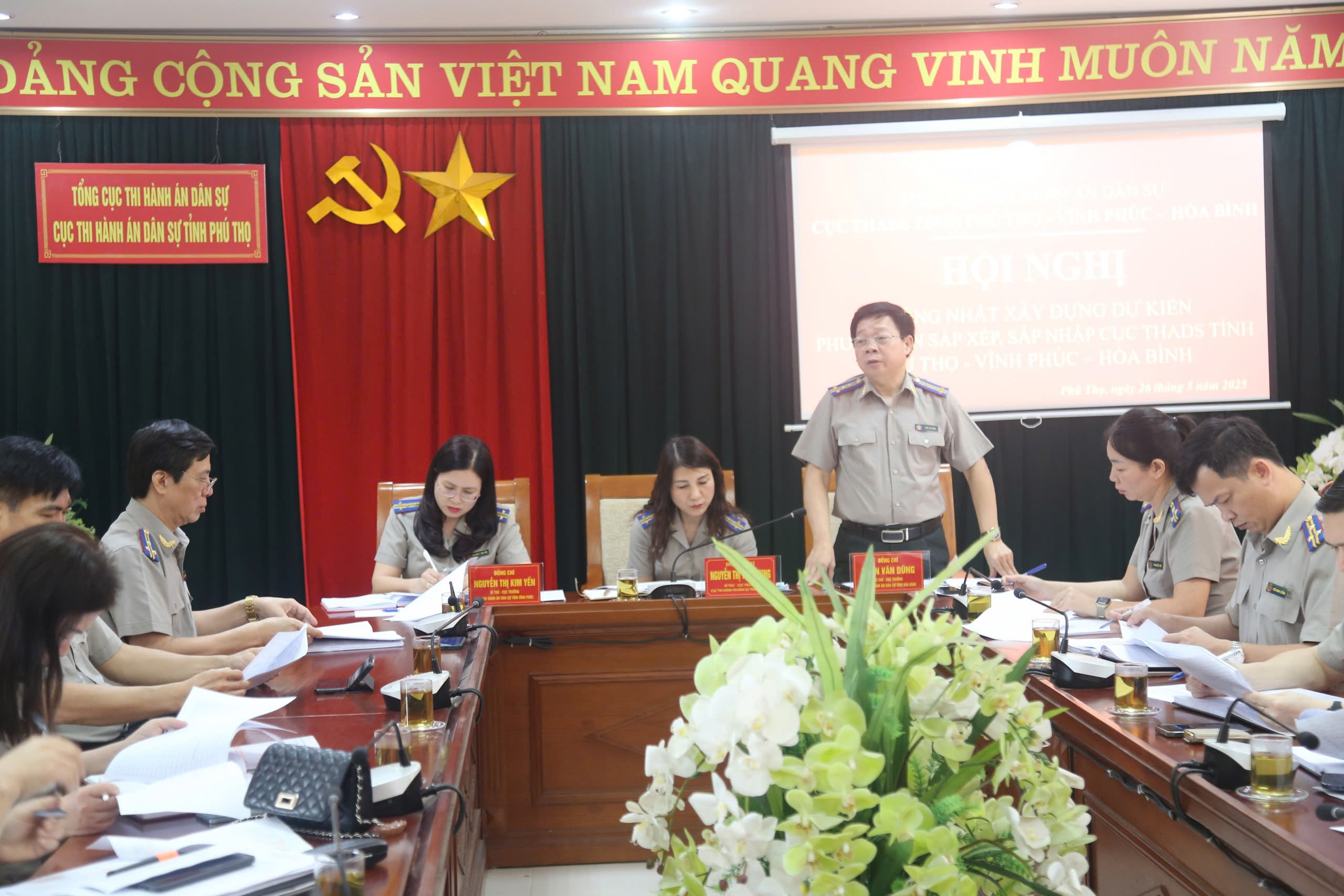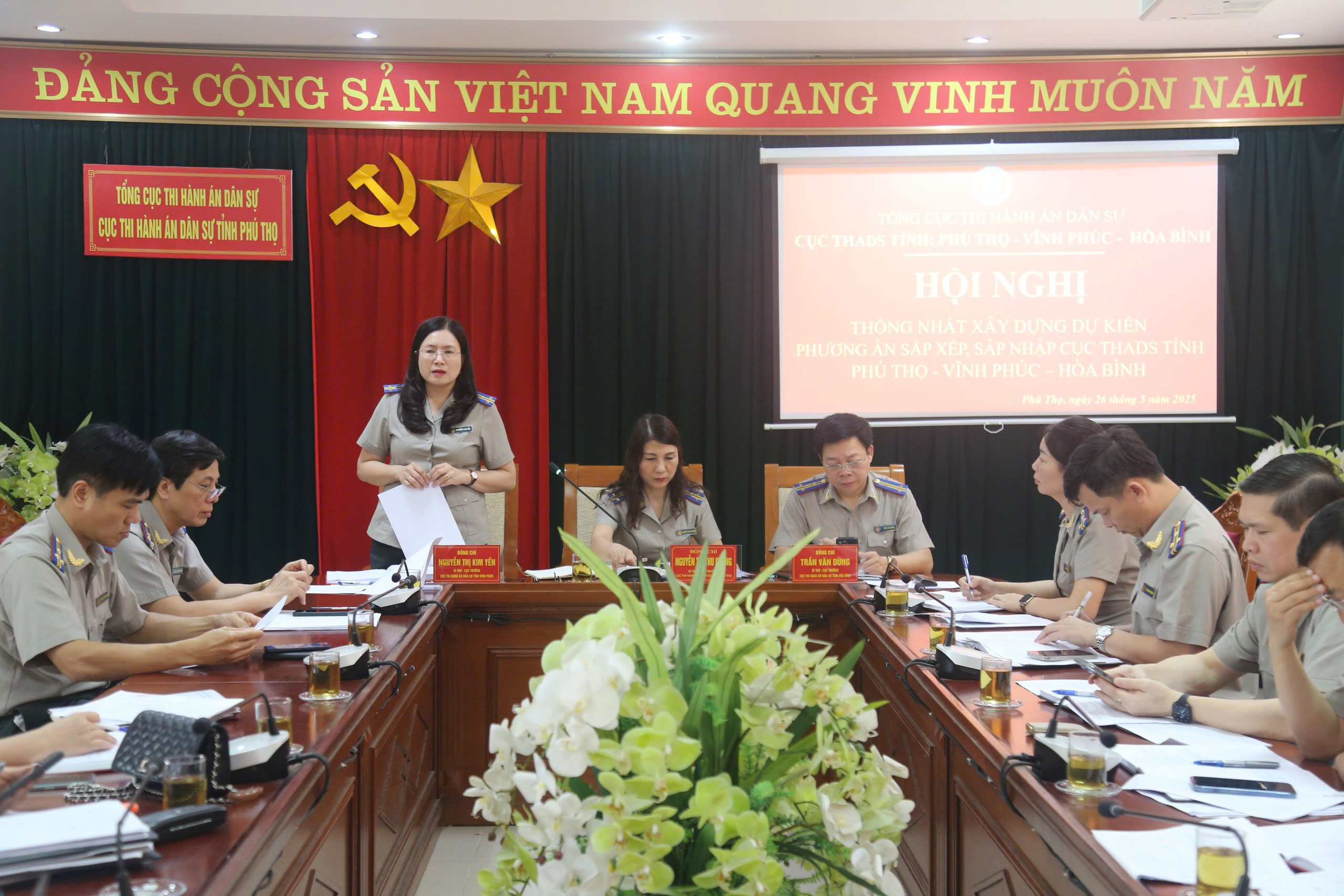 Thực hiện chủ trương của Đảng, Chính phủ, của Bộ Tư pháp và của Tổng cục Thi hành án dân sự về việc sắp xếp tổ chức bộ máy theo hướng tinh gọn, hoạt động hiệu lực, hiệu quả, ngày 26/5/2025, tại trụ sở Cục Thi hành án dân sự tỉnh Phú Thọ, Lãnh đạo 03 đơn vị Cục Thi hành án dân sự tỉnh Hòa Bình, Phú Thọ, Vĩnh Phúc đã tổ chức Hội nghị xây dựng dự thảo phương án sáp nhập các đơn vị.