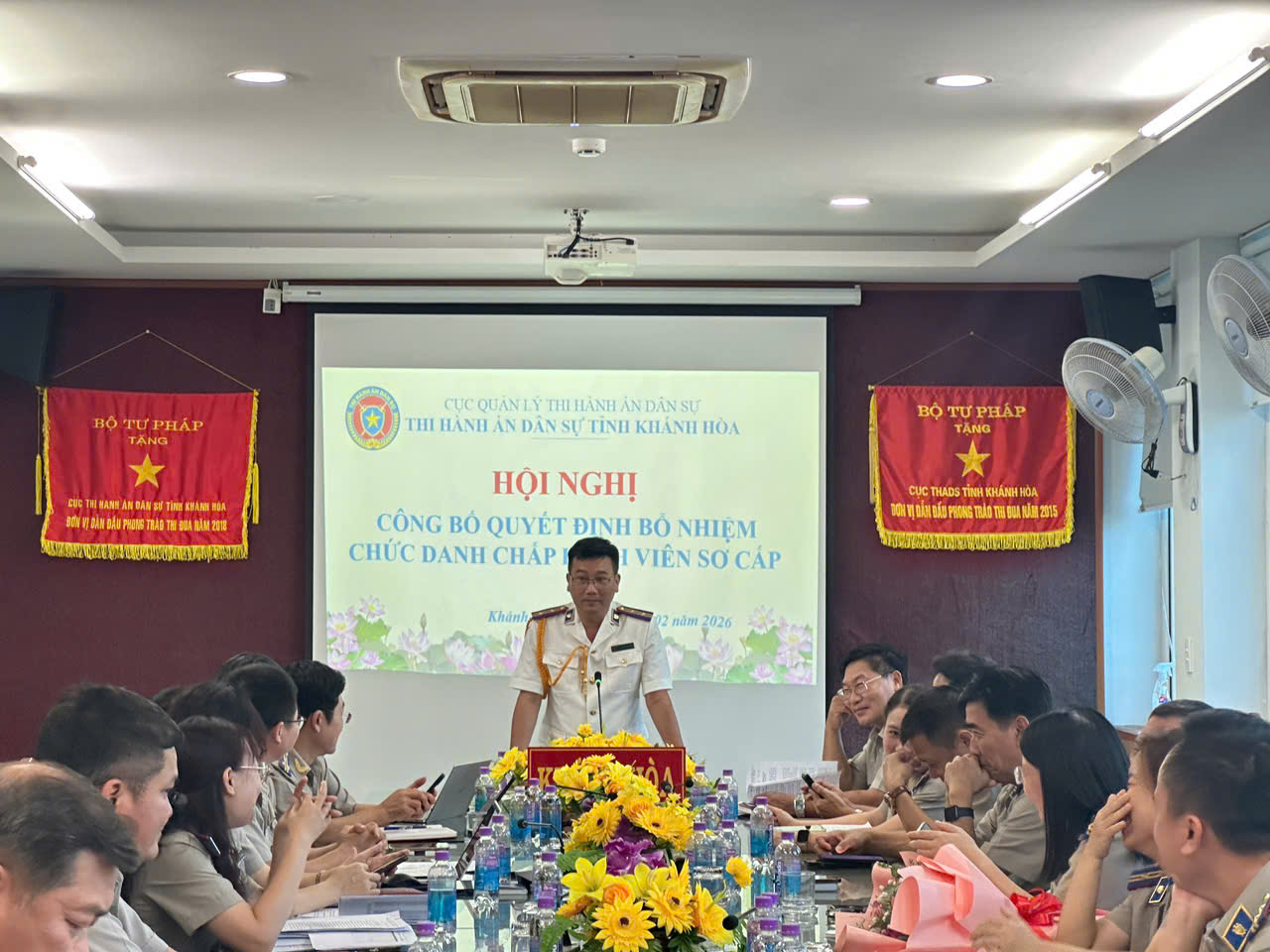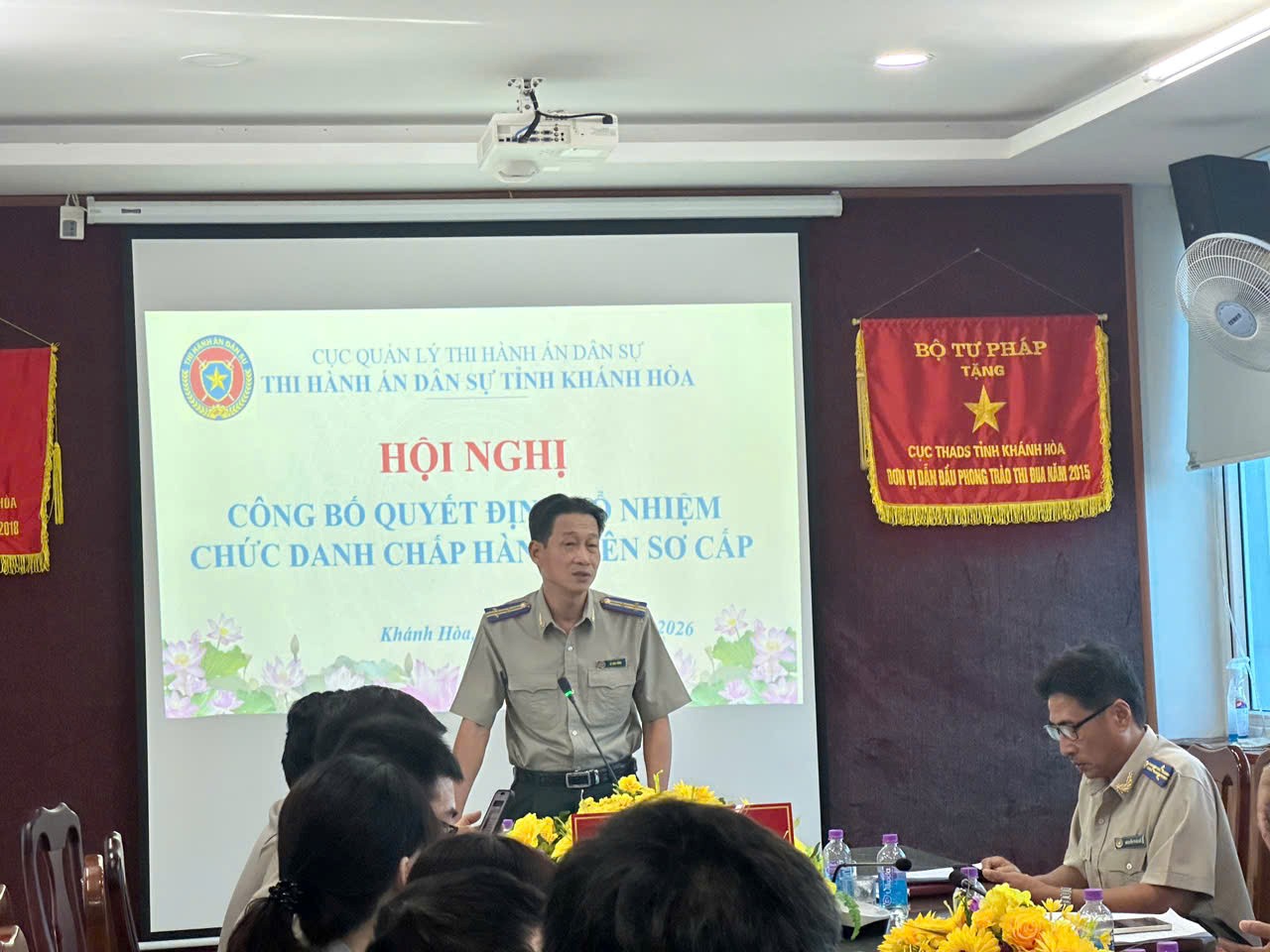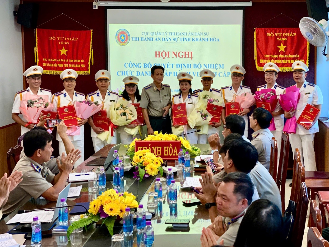 Tại buổi lễ, đồng chí Man Thắng Trí, Trưởng phòng Phòng Tổ chức cán bộ công bố 9 Quyết định của Bộ trưởng Bộ Tư pháp về việc bổ nhiệm Chấp hành viên sơ cấp. Lãnh đạo Thi hành án dân sự tỉnh trao Quyết định bổ nhiệm và tặng hoa chúc mừng cho 9 Chấp hành viên sơ cấp.