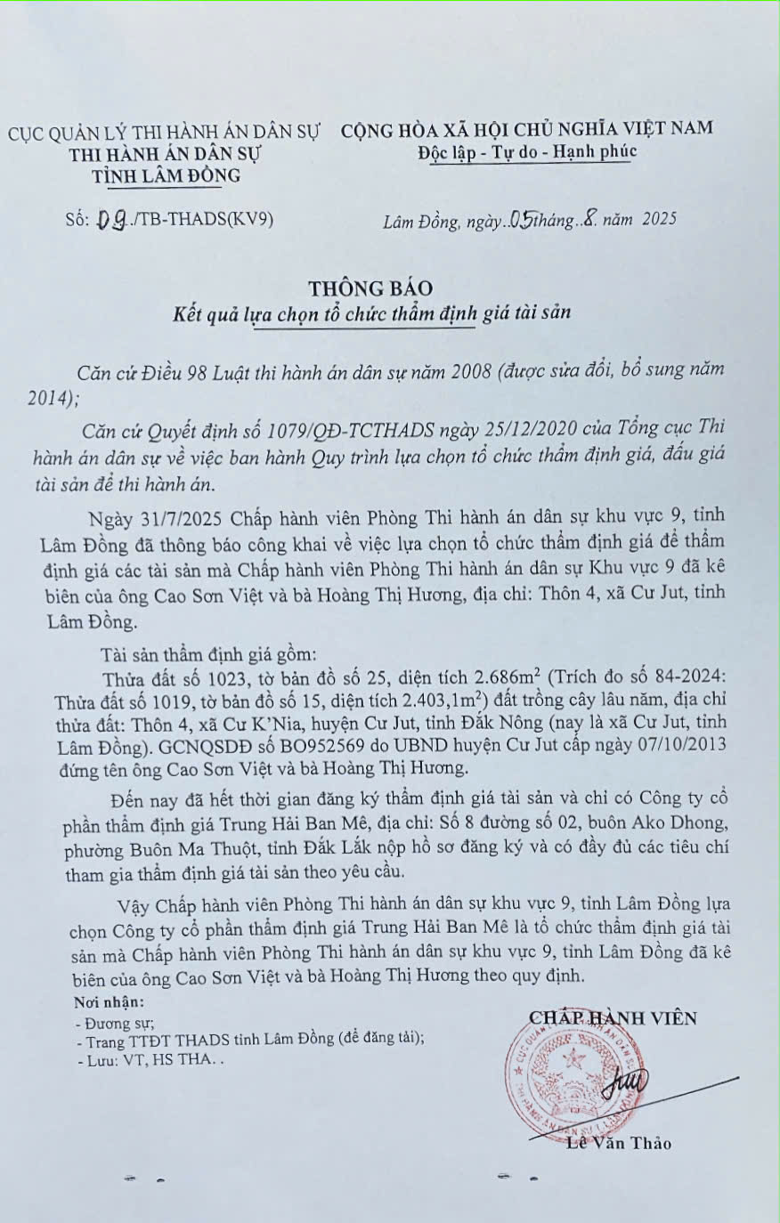Thông báo kết quả lựa chọn tổ chức thẩm định giá (Tb số 09/TB-THADS(KV9) ngày 05/8/2025 của phòng THADS Khu vực 9, tỉnh Lâm Đồng)