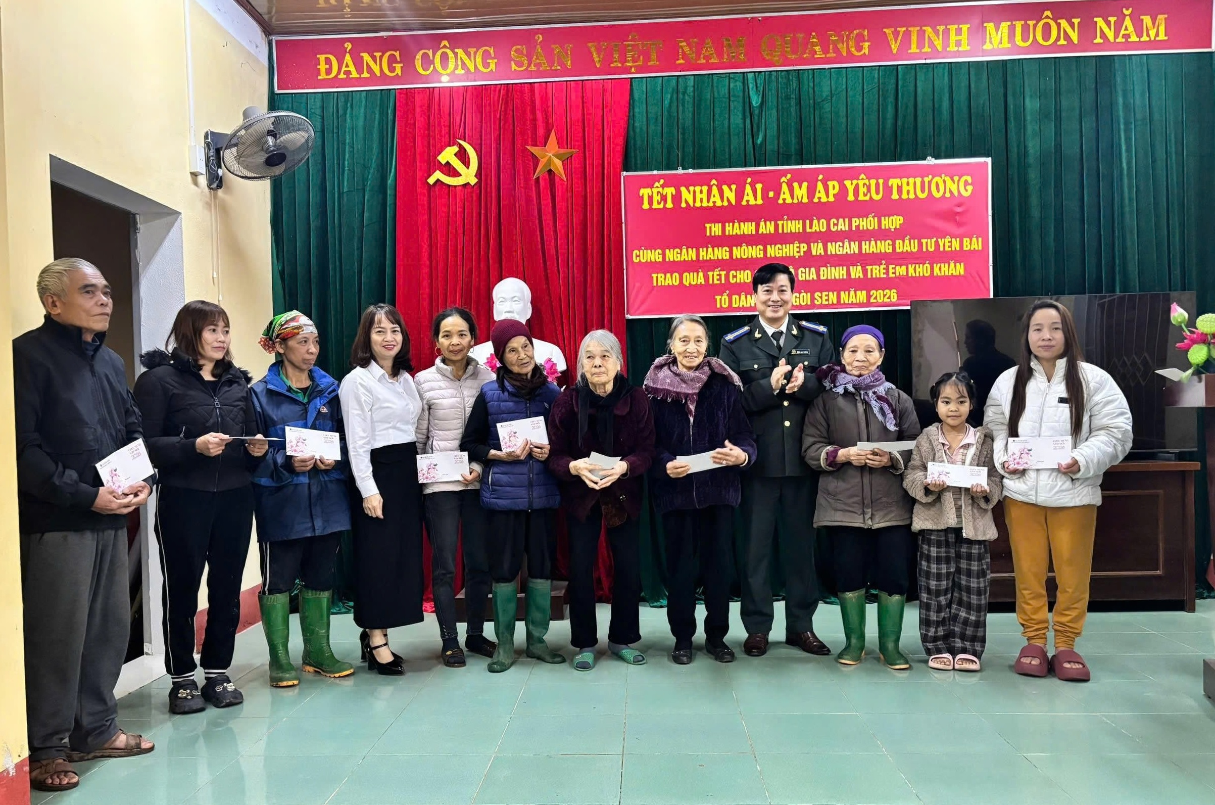 Đoàn đã thăm và tặng 60 xuất quà trị giá mỗi xuất quà là 500.000đ; tổng trị giá các xuất quà là 30.000.000đ để trao tặng cho các hộ nghèo có hoàn cảnh đặc biệt khó khăn của Tổ dân phố Ngòi Sen trong dịp tết Nguyên Đán Bính Ngọ. Những món quà tuy nhỏ về vật chất nhưng đó là hoạt động thiết thực, ý nghĩa, ý thức trách nhiệm đối với các gia đình có hoàn cảnh khó khăn, với cộng đồng và xã hội của tập thể cán bộ, công chức Thi hành án dân sự tỉnh Lào Cai, Ngân hàng Nông Nghiệp, Ngân hàng Đầu tư và phát triển Việt Nam, Chi nhánh Yên Bái gửi tới bà con để đón xuân Bính Ngọ 2026 thật ấm áp, vui tươi.