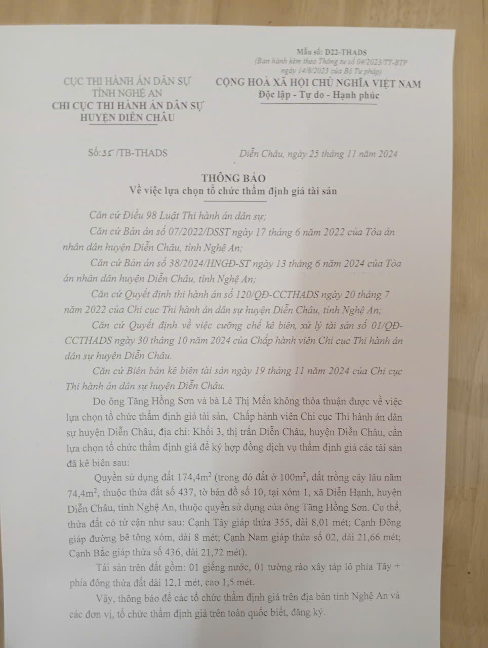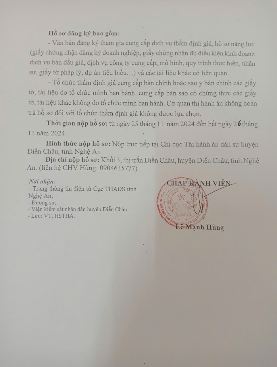 Chi cục THADS Diễn Châu TB về việc lựa chọn Tổ chức thẩm định giá tài sản số 35/TB-CCTHADS ngày 25/11/2024: Quyền sử dụng 258.4m2 đất ở, thuộc thửa đất số 437, tờ bản đồ số 10, tại xóm 1, xã Diễn Hạnh, huyện Diễn Châu,, tỉnh Nghệ An