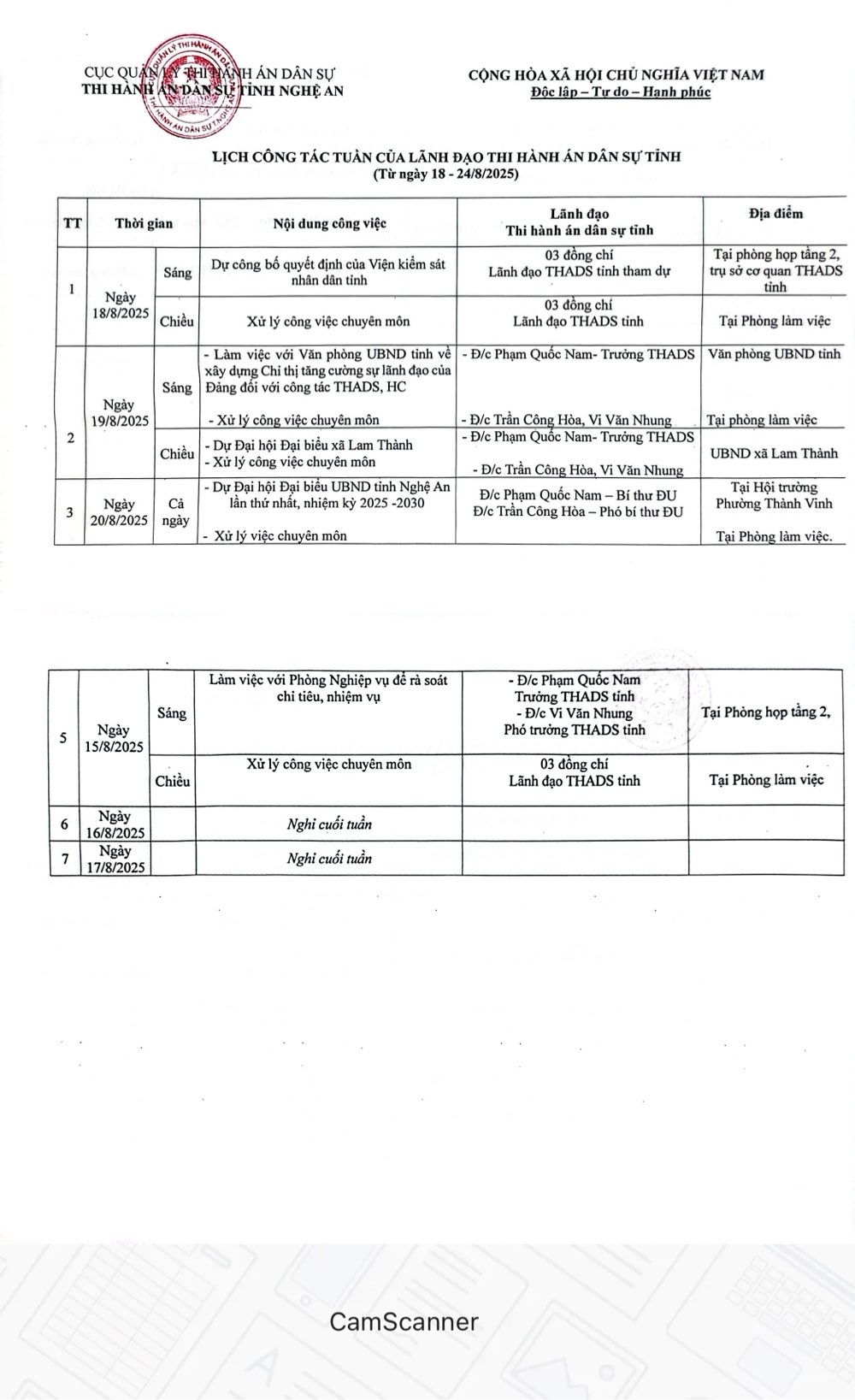 Lịch công tác tuần của Lãnh đạo Cục THADS tỉnh Nghệ An (từ ngày 18 đến 24/8/2025)