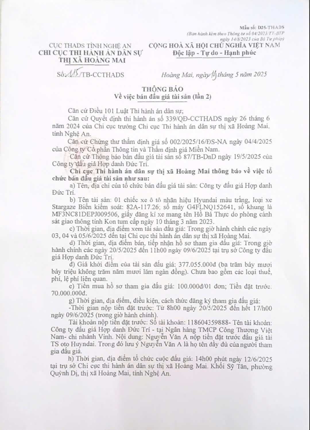 Chi cục THADS Thị xã Hoàng Mai TB về việc Bán giá tài sản số 115/TB-CCTHADS ngày 19/5/2025: Tài sản là 01 xe ô tô nhãn hiệu Huyndai màu trắng, thị xã Hoàng Mai, Nghệ An