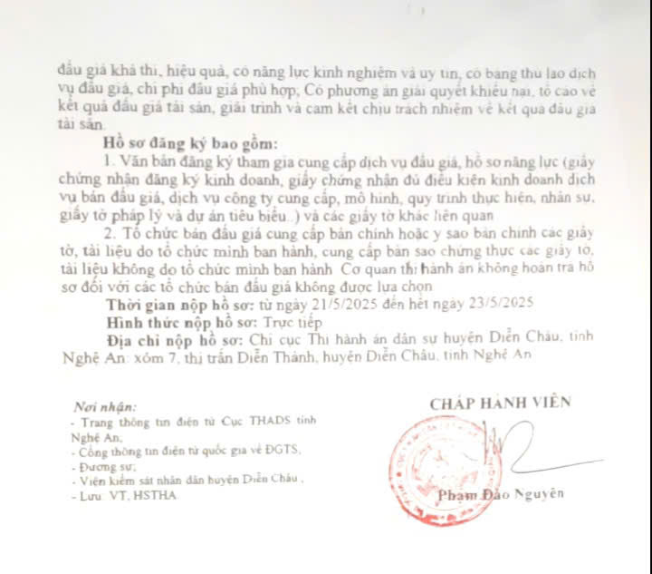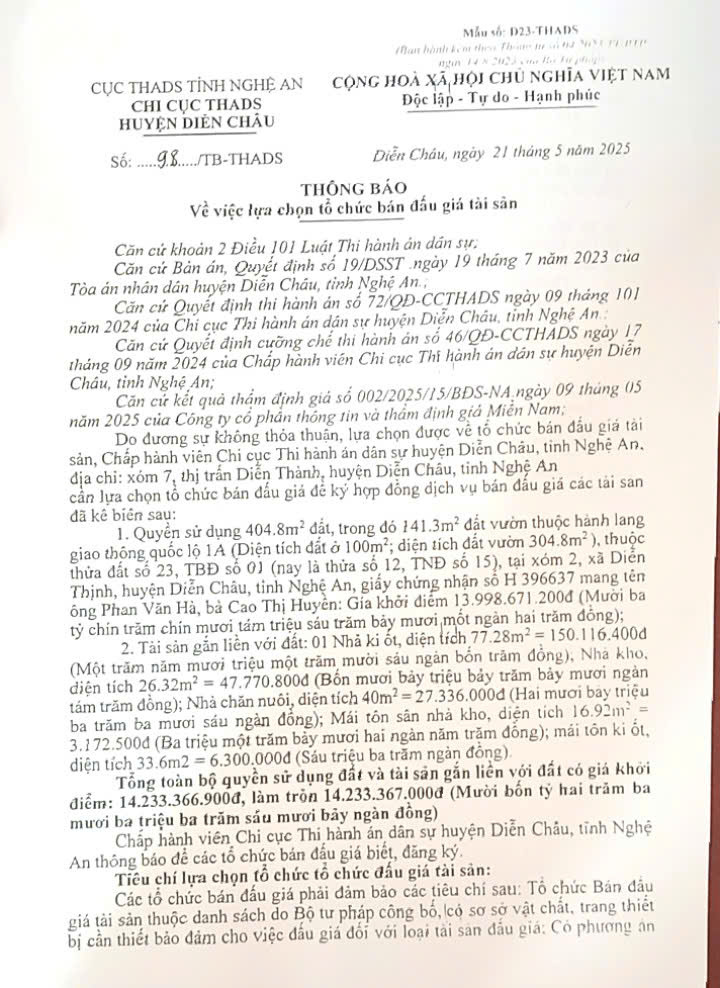 Chi cục THADS Diễn Châu TB về việc lựa chọn Tổ chức bán đấu giá tài sản số 98/TB-CCTHADS ngày 21/5/2025: Quyền sử dụng đất và tài sản trên thửa đất 23, tờ bản đồ số 01 (nay là thửa 12, TBĐ số 15), xóm 2, Diễn Thịnh, huyện Diễn Châu, tỉnh Nghệ An