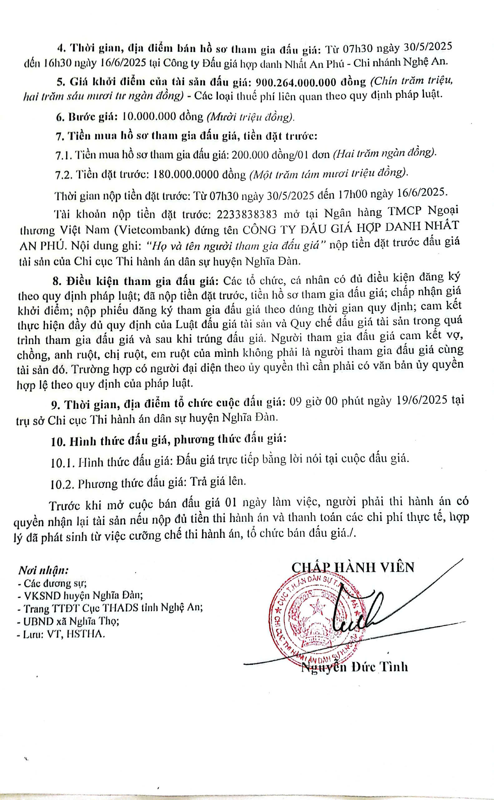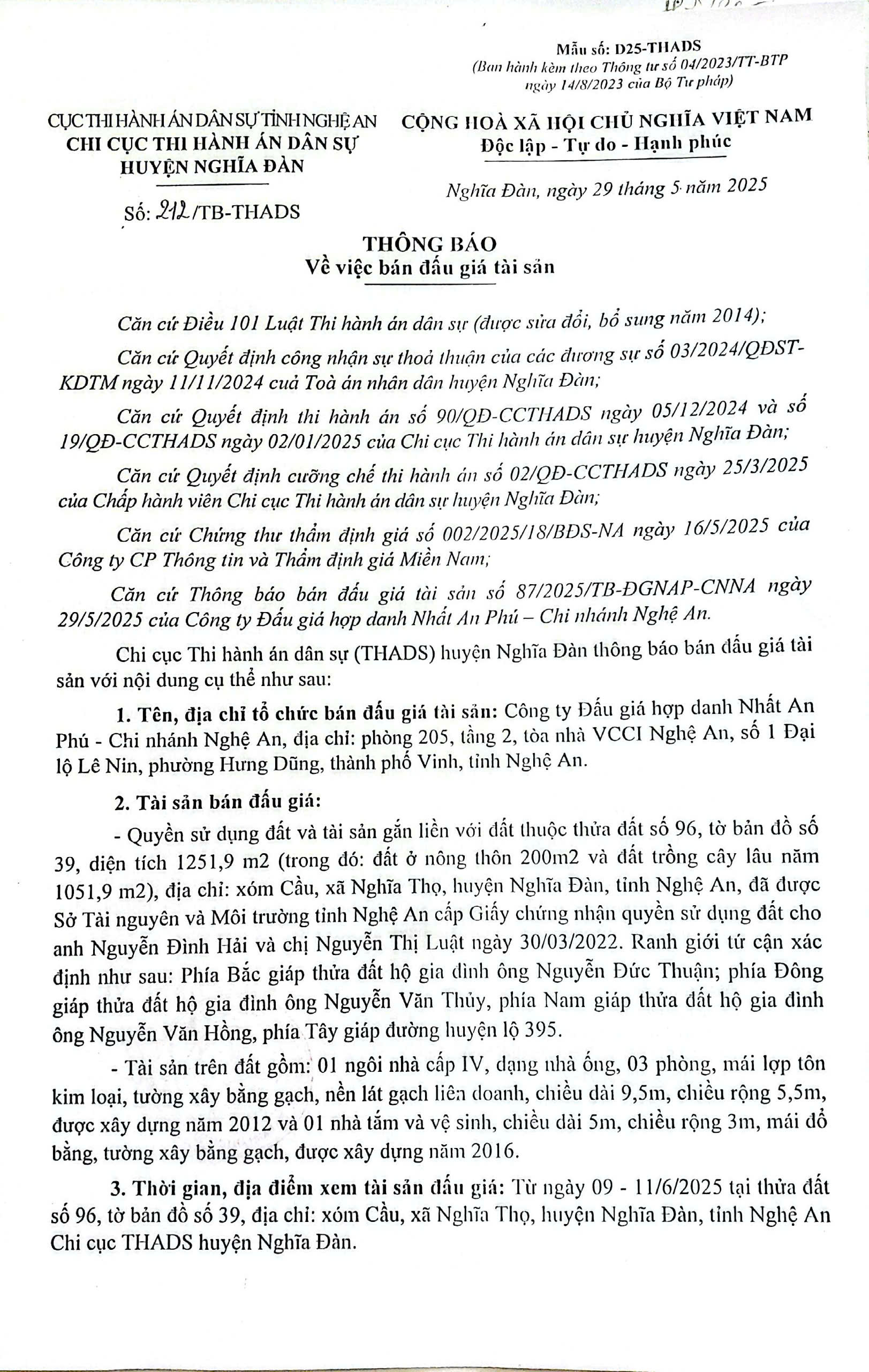 Chi cục THADS Nghĩa Đàn TB về việc Bán đấu giá tài sản số 212/TB-CCTHADS ngày 29/5/2025: Quyền sử dụng đất và tài sản trên đất, thuộc thửa đất số 96, tờ bản đồ số 39, xóm Cầu, xã Nghĩa Thọ, huyện Nghĩa Đàn,, tỉnh Nghệ An