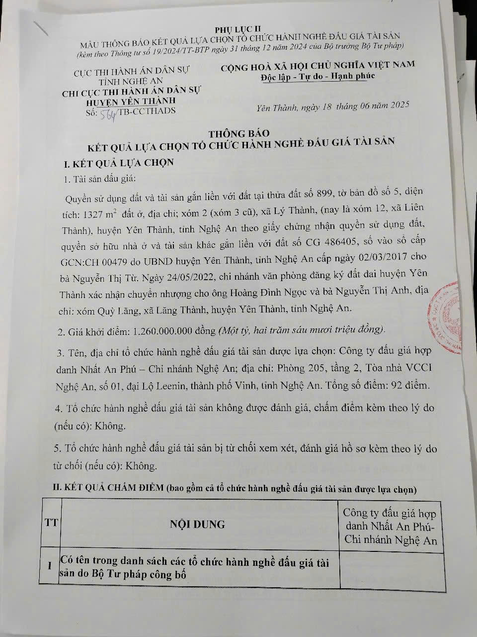 Chi cục THADS Yên Thành Thông báo Kết quả lựa chọn Tổ chức hành nghề đấu giá TS số 564/TB-CCTHADS ngày 18/6/2025: Quyền SDĐ và TS gắn liền với đất tại thửa số 899, TBĐ số 5, xóm 2 (xóm 3 cũ), xã Lý Thành (nay là xóm 12), xã Liên Thành, Yên Thành, Nghệ An