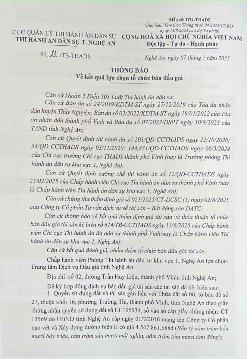 THi hành án dân sự tỉnh Nghệ An TB về việc Lựa chọn Tổ chứchành nghề đấu giá tài sản số 23/TB-CCTHADS ngày 07/7/2025: Quyền sử dụng đất và tài sản trên đất tại thửa đất số 06, tờ bản đồ số 27,khối 16, phường Trường Thi, Tp.Vinh, tỉnh Nghệ An