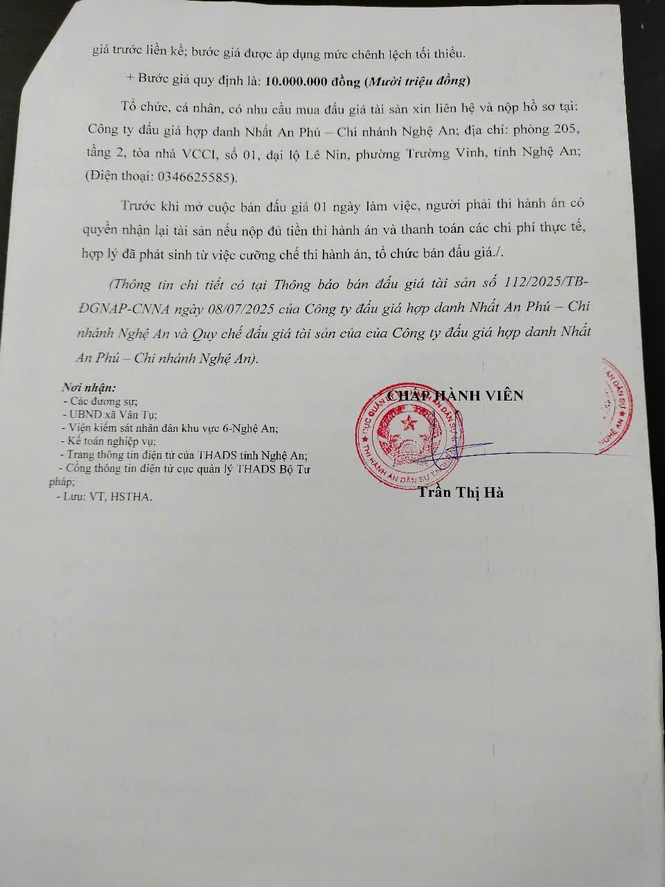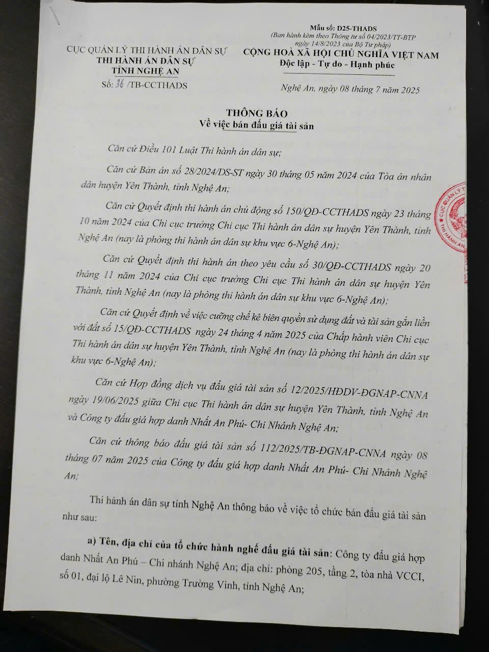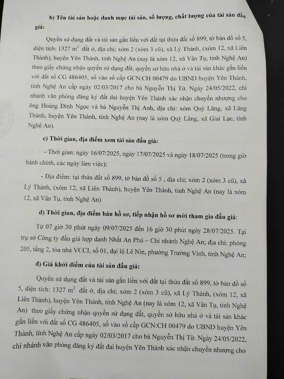 THi hành án dân sự tỉnh Nghệ An Thông báo về việc bán đấu giá TS số 36/TB-CCTHADS ngày 08/7/2025: Quyền SDĐ và TS gắn liền với đất tại thửa số 899, TBĐ số 5, xóm 2 (xóm 3 cũ), xã Lý Thành (nay là xóm 12), xã Liên Thành, Yên Thành, Nghệ An
