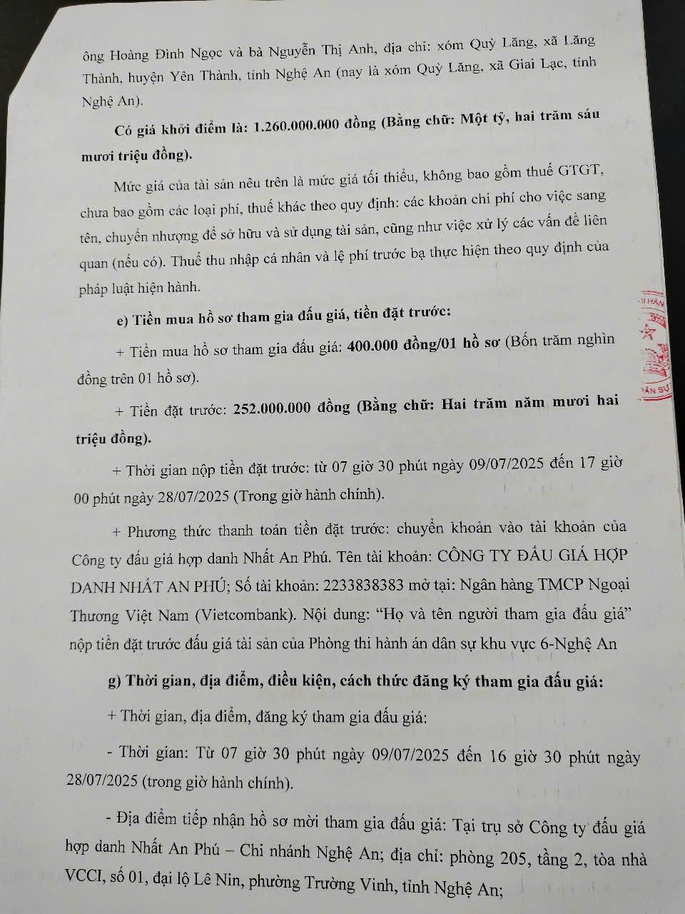 Bán đấu giá Thửa đất số 358, tờ bản đồ 09, diện tích 520m2 tại xóm 3, xã Nghi Phú, Thành phố Vinh, Nghệ An. mang tên Thái Khắc Xuân và bà Hoàng Thị Thìn