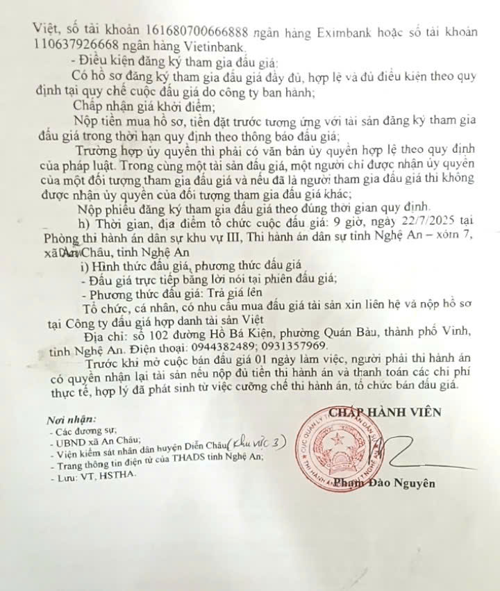 THi hành án dân sự tỉnh Nghệ An TB về việc Bán đấu giá tài sản số 16/TB-CCTHADS ngày 04/7/2025: Quyền sử dụng đất và tài sản trên thửa đất 23, tờ bản đồ số 01 (nay là thửa 12, TBĐ số 15), xóm 2, Diễn Thịnh, huyện Diễn Châu, tỉnh Nghệ An