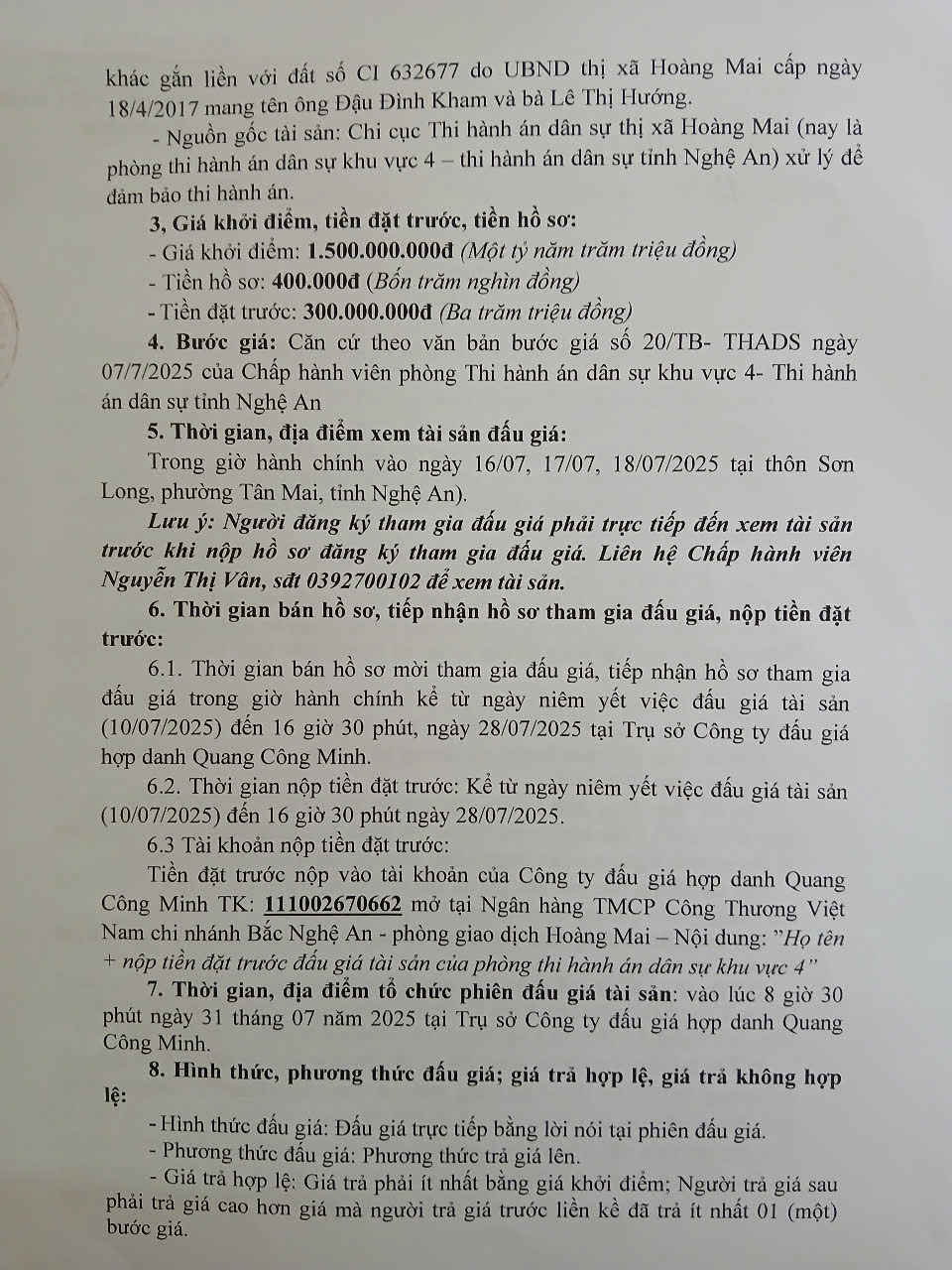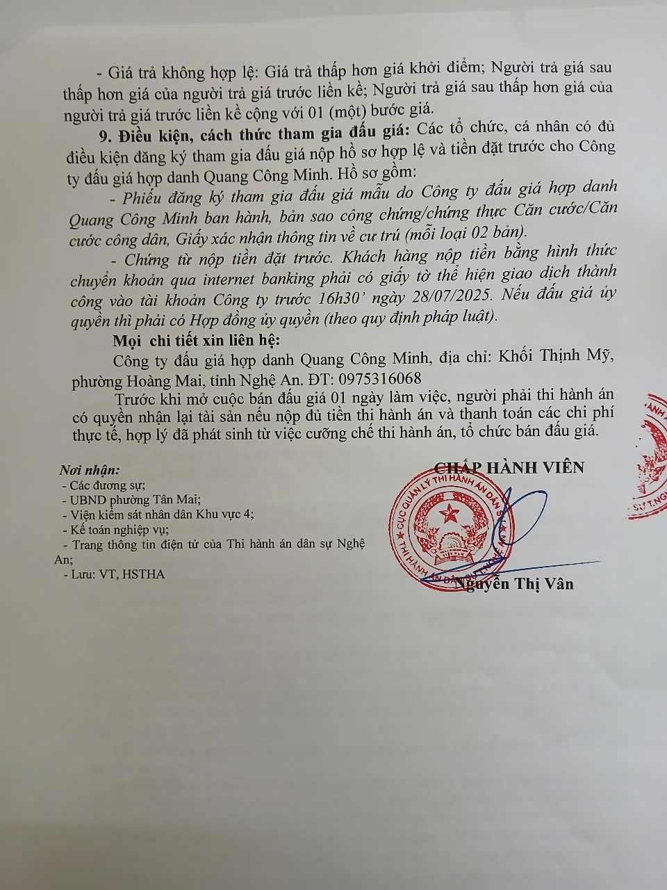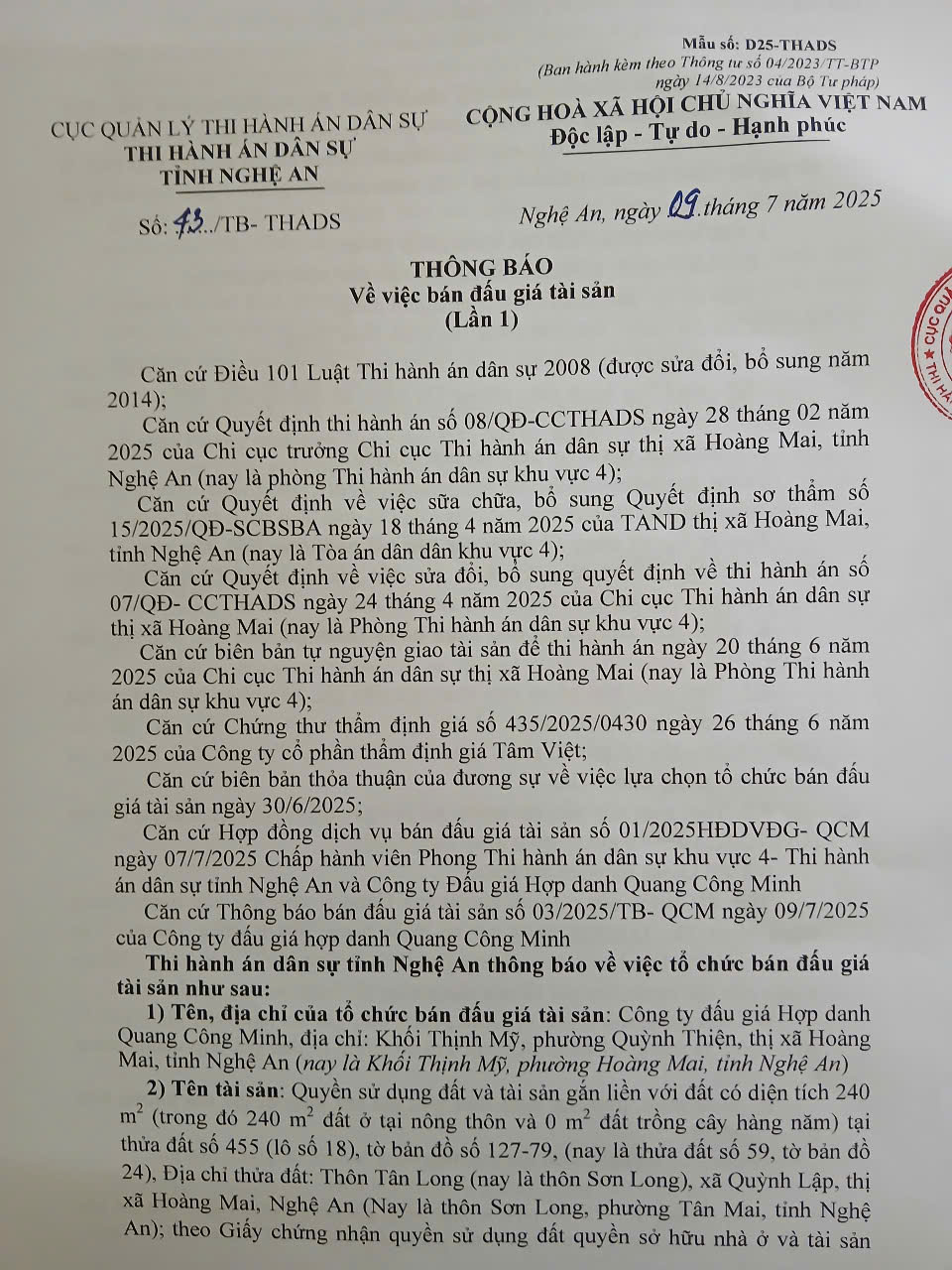 THi hành án dân sự tỉnh Nghệ An Thông báo về việc bán đấu giá TS số 43/TB-CCTHADS ngày 09/7/2025: Quyền SDĐ và TS gắn liền với đất tại thửa số 59, TBĐ số 24, thôn Sơn Long, phường Tân Mai, tỉnh Nghệ An