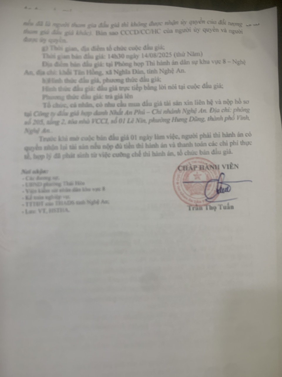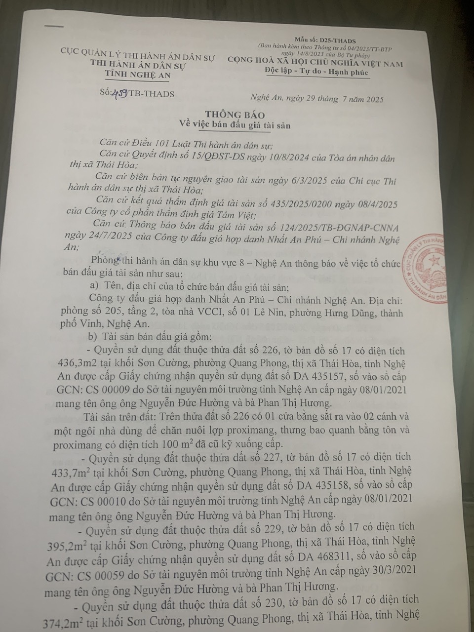 THADS Nghệ An TB về việc bán đấu giá tài sản số 459/TB-THADS ngày 29/7/2025: Quyền sử dụng đất và tài sản trên đất tại thửa đất số 226,227,229,230,231,232,233, tờ bản đồ số 17, Quang Trung, Thái hòa, tỉnh Nghệ An
