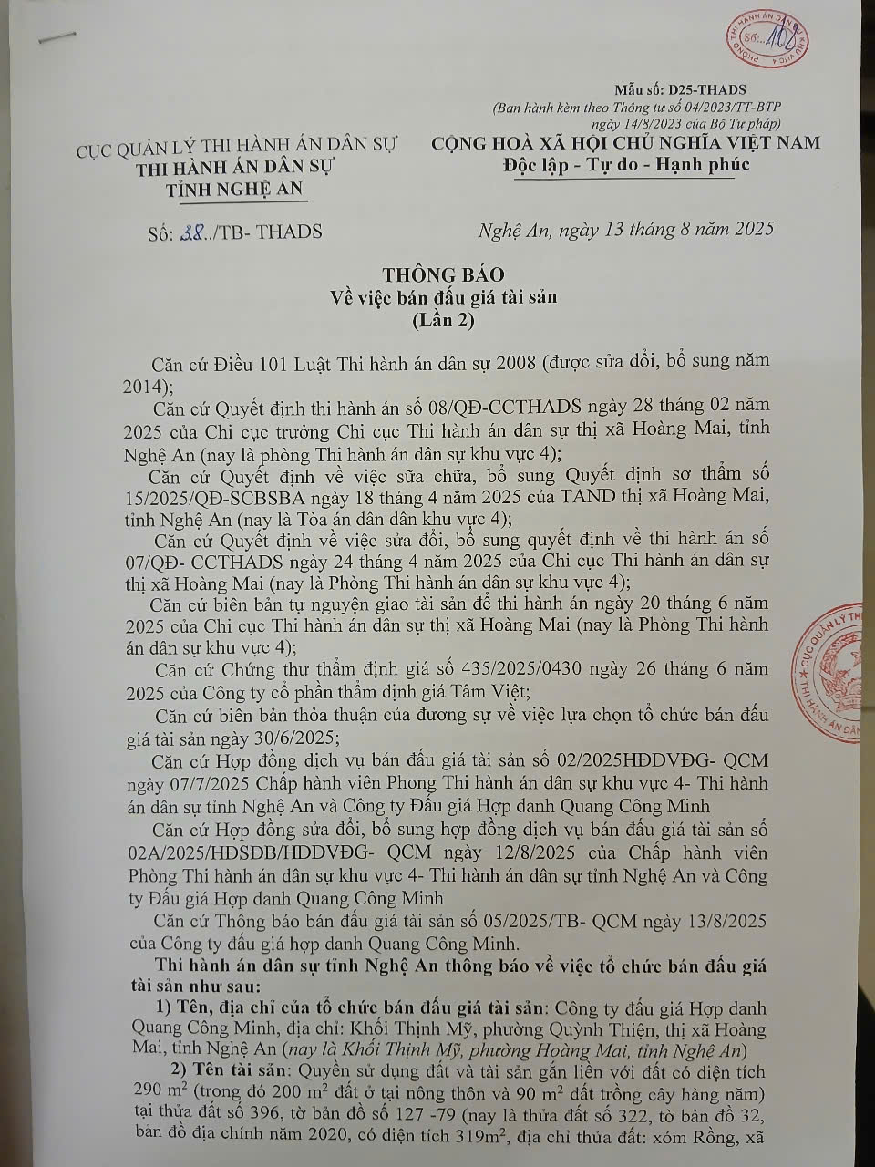 THADS Nghệ An TB về việc bán đấu giá tài sản số 38/TB-THADS ngày 13/8/2025: Quyền sử dụng đất và tài sản trên đất tại thửa đất số 322, tờ bản đồ số 32, Quỳnh Lập, Tân Mai, tỉnh Nghệ An