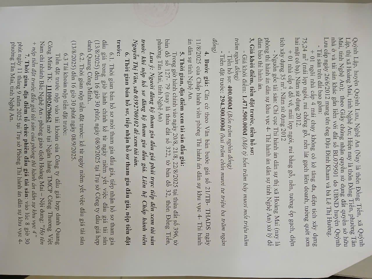 Bán đấu giá Thửa đất số 358, tờ bản đồ 09, diện tích 520m2 tại xóm 3, xã Nghi Phú, Thành phố Vinh, Nghệ An. mang tên Thái Khắc Xuân và bà Hoàng Thị Thìn