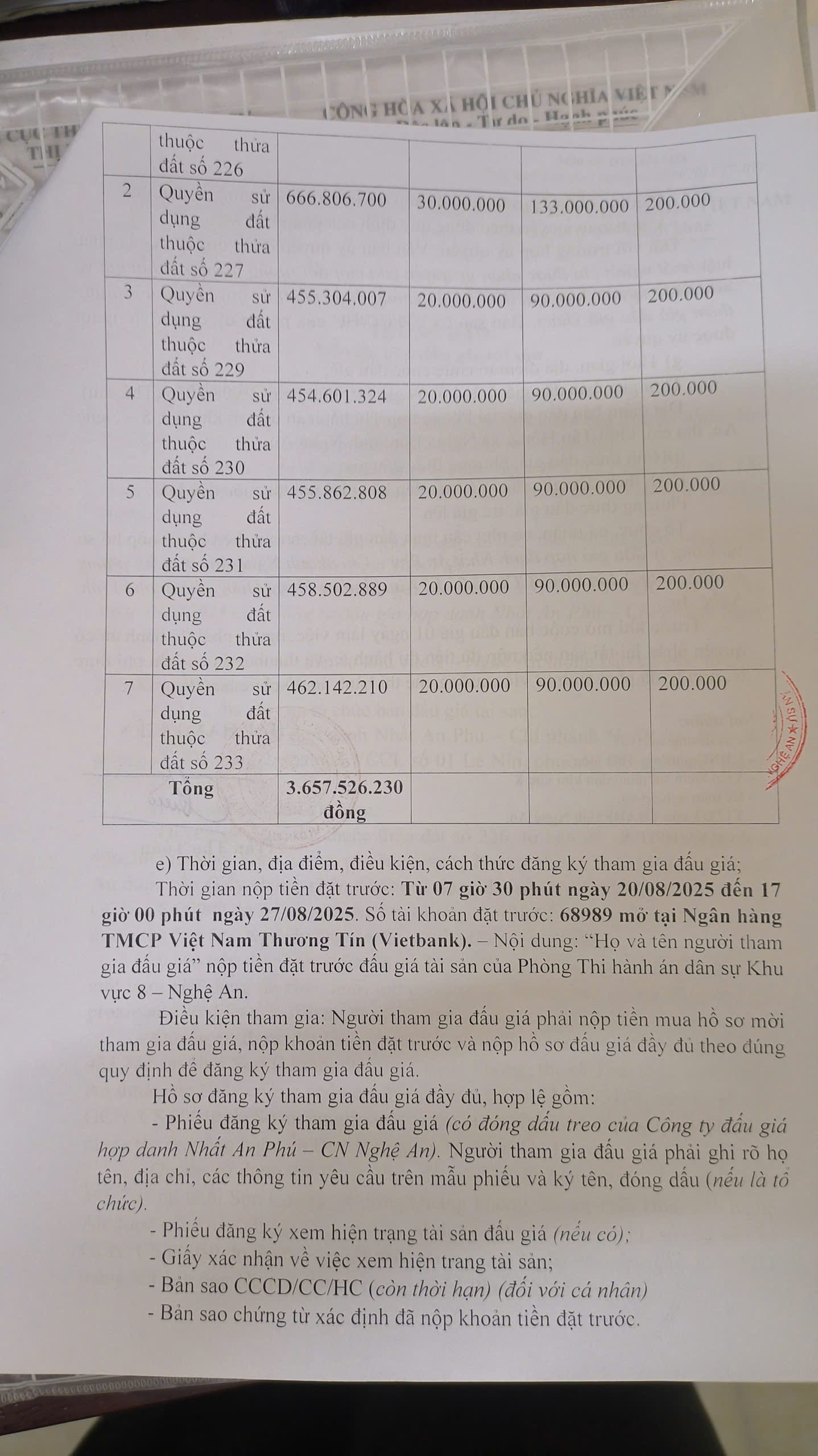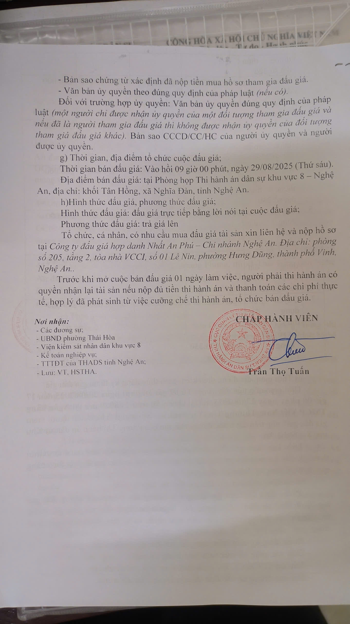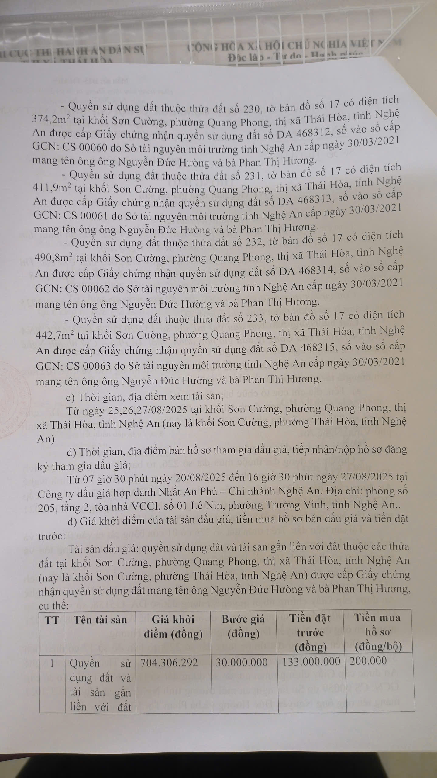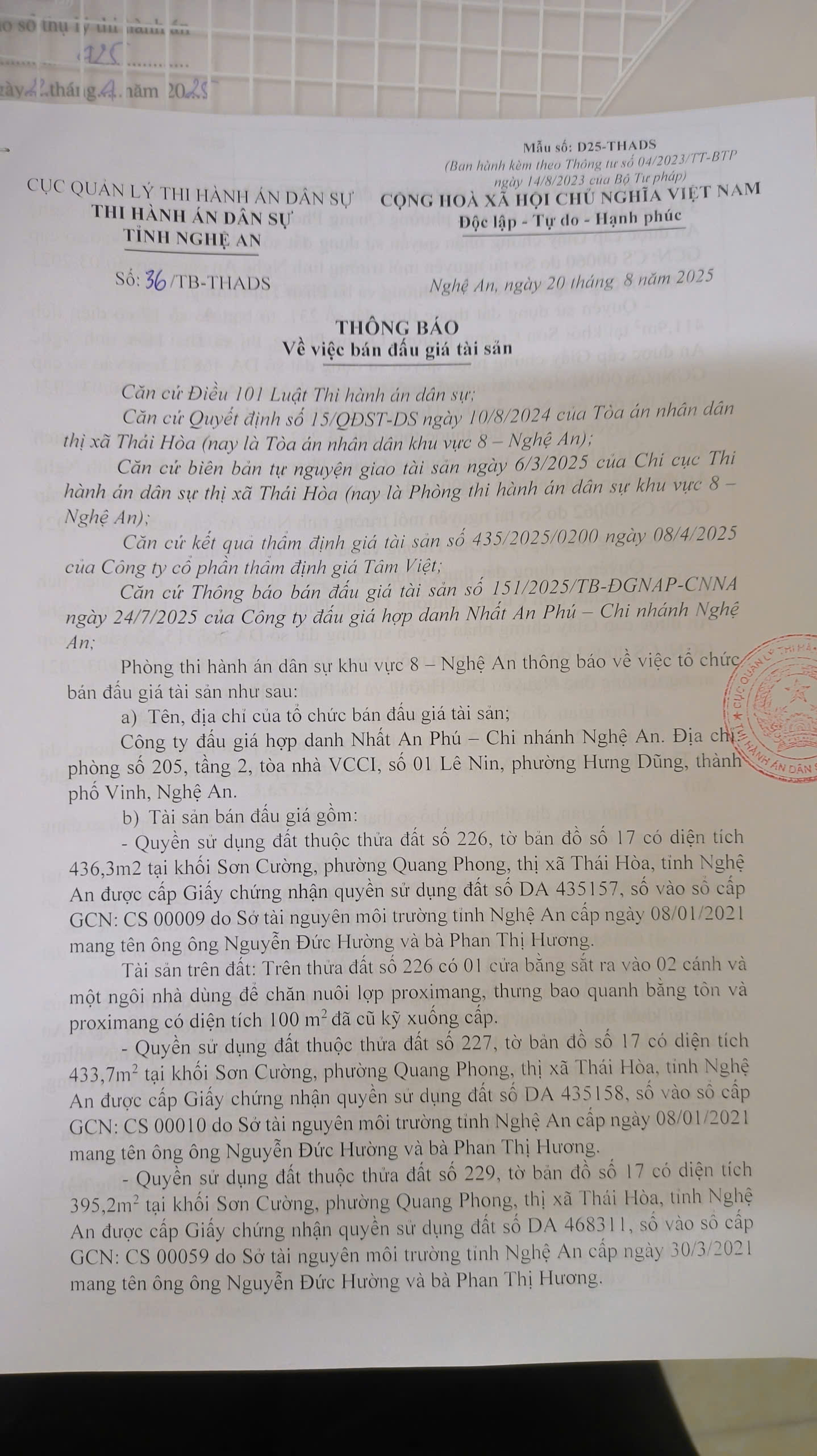 THADS Nghệ An TB về việc bán đấu giá tài sản số 36/TB-THADS ngày 20/8/2025: Quyền sử dụng đất và tài sản trên đất tại thửa đất số 226,227,229,230,231,232,233, tờ bản đồ số 17, Quang Trung, Thái hòa, tỉnh Nghệ An