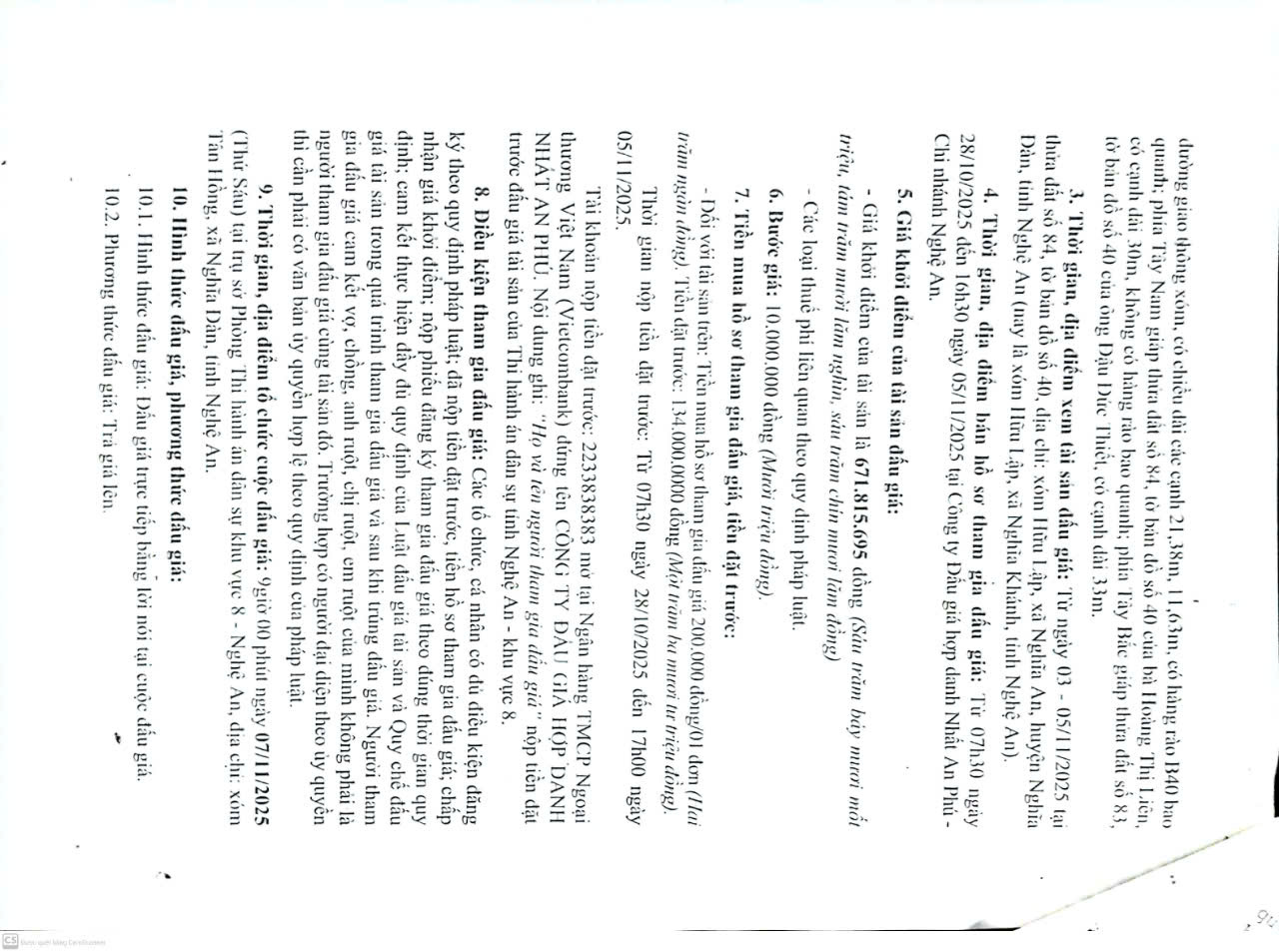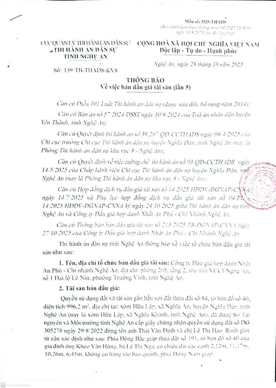 THADS Nghệ An TB về việc Bán đấu giá tài sản số 139/TB-THADS.KV8 ngày 28/10/2025: Quyền sử dụng đất và tài sản trên đất tại thửa thửa đất số 84, tờ bản đồ số 40, địa chỉ: Hữu Lập, Nghĩa Khánh, tỉnh Nghệ An