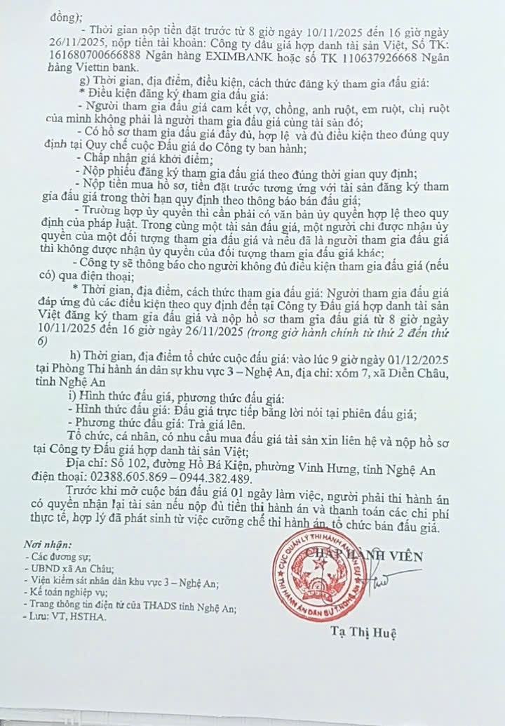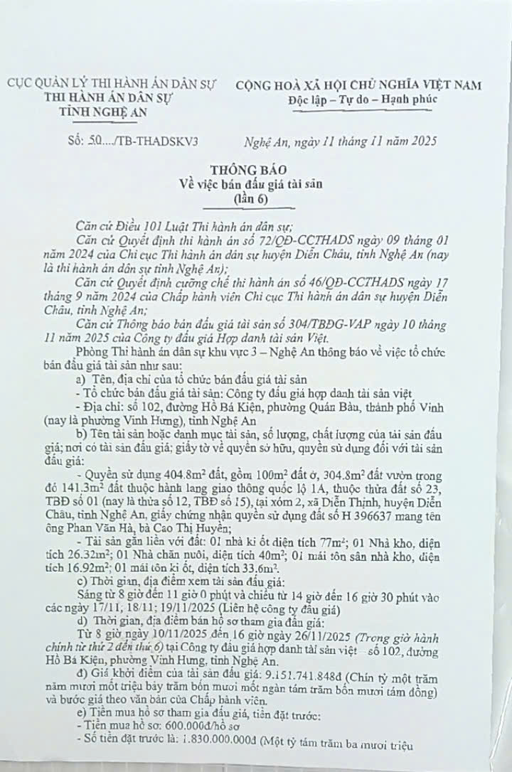 THADS Nghệ An TB về việc bán đấu giá tài sản số 50/TB-THADS.KV3 ngày 11/11/2025: Quyền sử dụng đất và tài sản trên đất tại thửa đất số 23, tờ bản đồ số 01 (nay là thửa 12, TBĐ 15), Diễn Châu, tỉnh Nghệ An