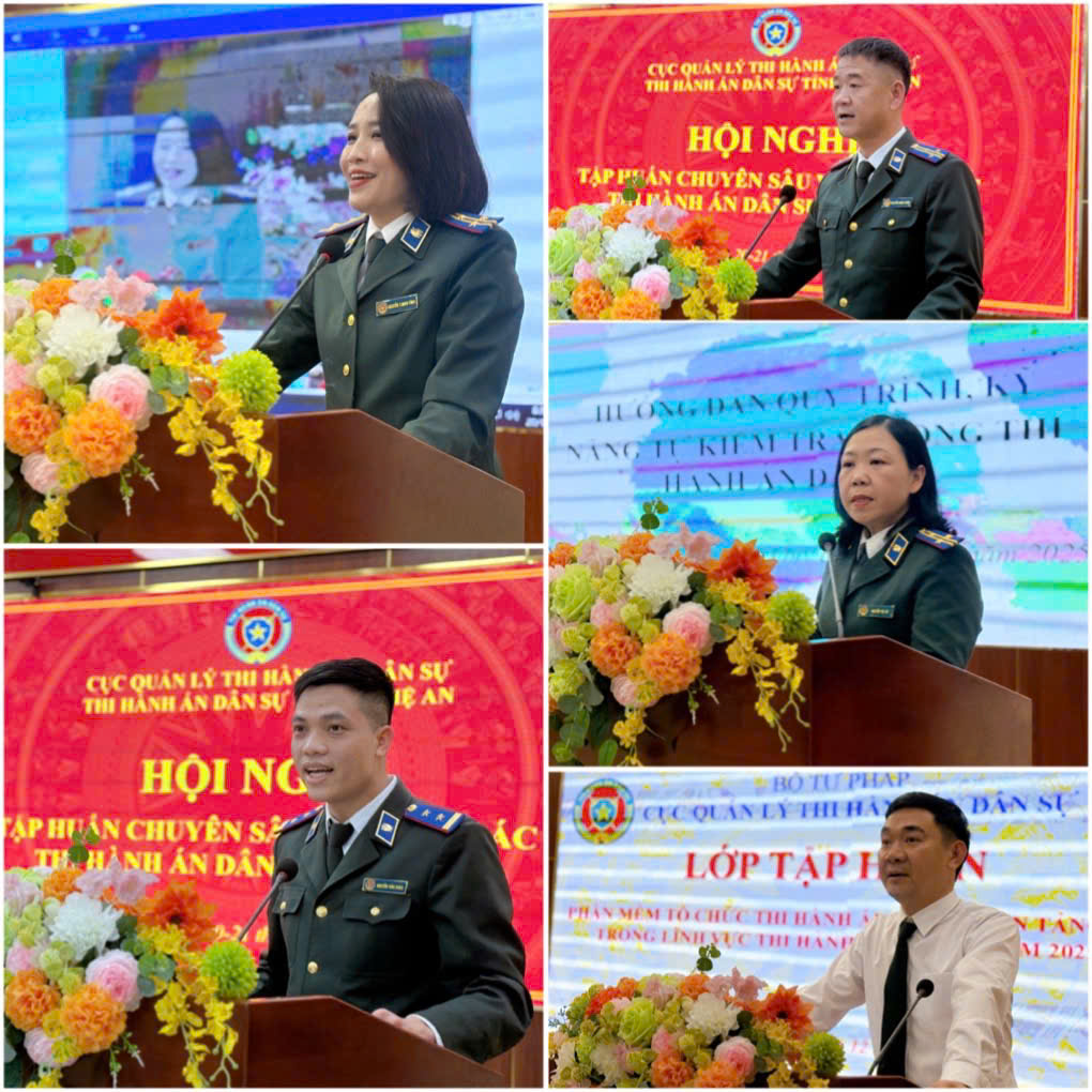 Trong 02 ngày diễn ra Hội nghị tập huấn, các đồng chí Báo cáo viên được phân công đã quán triệt 09 chuyên đề: (i) Triển khai nền tảng số trong lĩnh vực THADS; (ii) Khó khăn vướng mắc và một số nội dung lưu ý khi thực hiện Quy trình tổ chức thi hành án trong nội bộ cơ quan THADS; (iii) Hướng dẫn thực hiện Quy trình tiếp nhận và xử lý vật chứng, tài sản tạm giữ trong THADS và một số nội dung lưu ý khi thực hiện; (iv) Thực trạng và một số một số vi phạm trong công tác tiếp nhận, bảo quản và xử lý vật chứng THA; (v) Quán triệt một số nội dung về Luật số 81/2025/QH15 sửa đổi, bổ sung một số điều Luật Tổ chức TAND; Luật số 85/2025/QH15 sửa đổi, bổ sung một số điều của Bộ luật tố tụng DS, Tố tụng Hành chính; Thông tư 03/2025/TT-VKSTC ngày 30/6/2025 của VKSND tối cao về tiếp nhận nhiệm vụ, thực hiện thấm quyền của Viện kiểm sát nhân dân các cấp có liên quan đến công tác THADS, HC; (vi) Hướng dẫn công tác tiếp công dân, xử lý, giải quyết đơn khiếu nại, tố cáo, kiến nghị, phản ánh theo quy trình và một số nội dung lưu ý khi thực hiện; (vii) Hướng dẫn quy trình kỹ năng, tự kiểm tra trong THADS của cơ quan THADS tỉnh, Phòng THADS khu vực và công chức; (viii) Quy trình quản lý, sử dụng, thanh quyết toán biên lại điện tử và một số lưu ý; (ix) Hướng dẫn Quy trình thu, chi tiền THADS và một số nội dung lưu ý khi thực hiện.