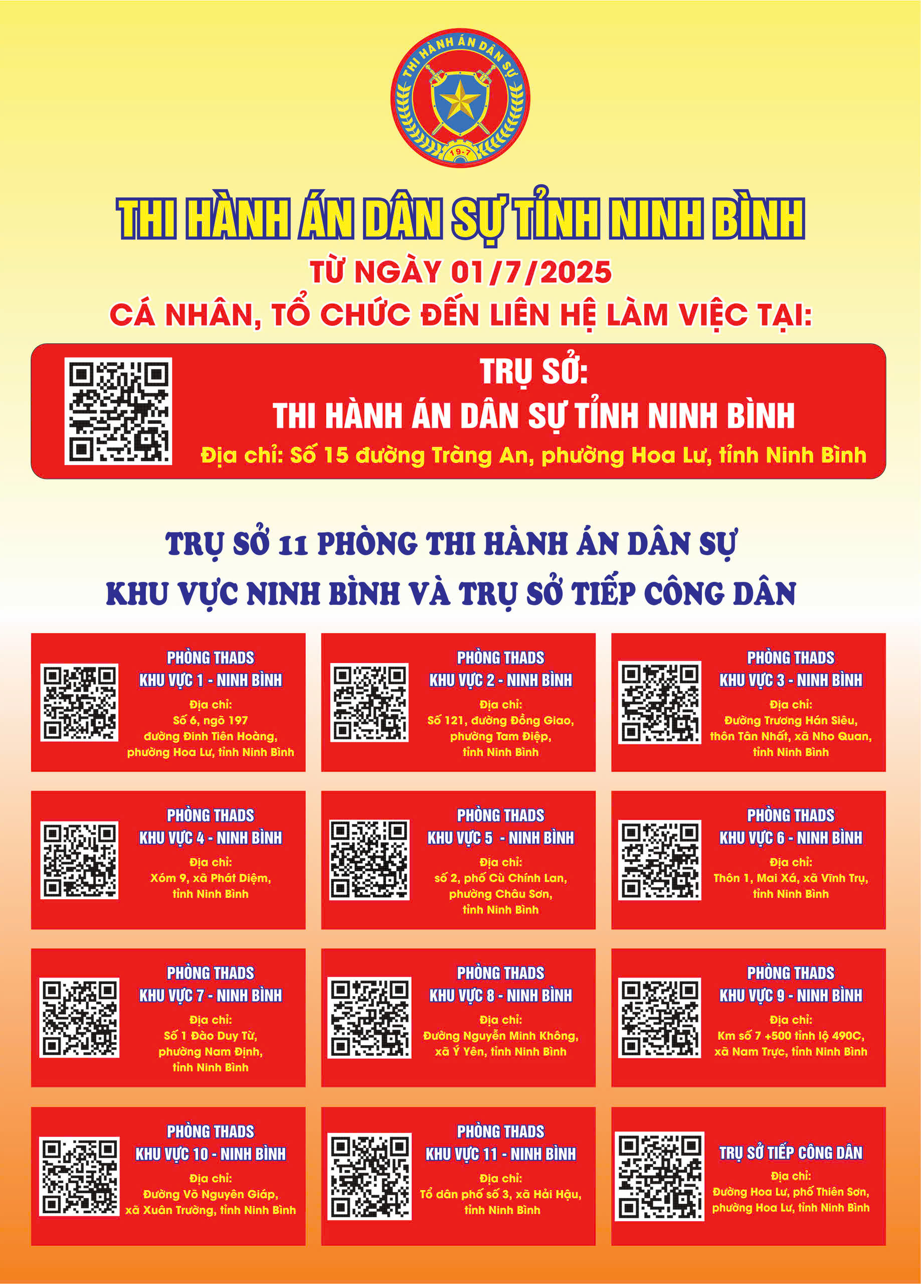 Thông báo trụ sở THADS tỉnh Ninh Bình và 11 phòng THADS khu vực, trụ sở tiếp công dân