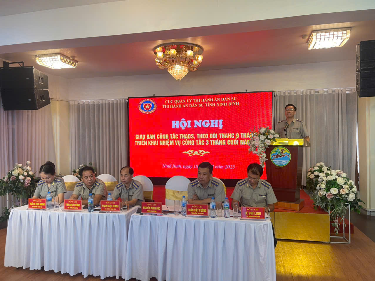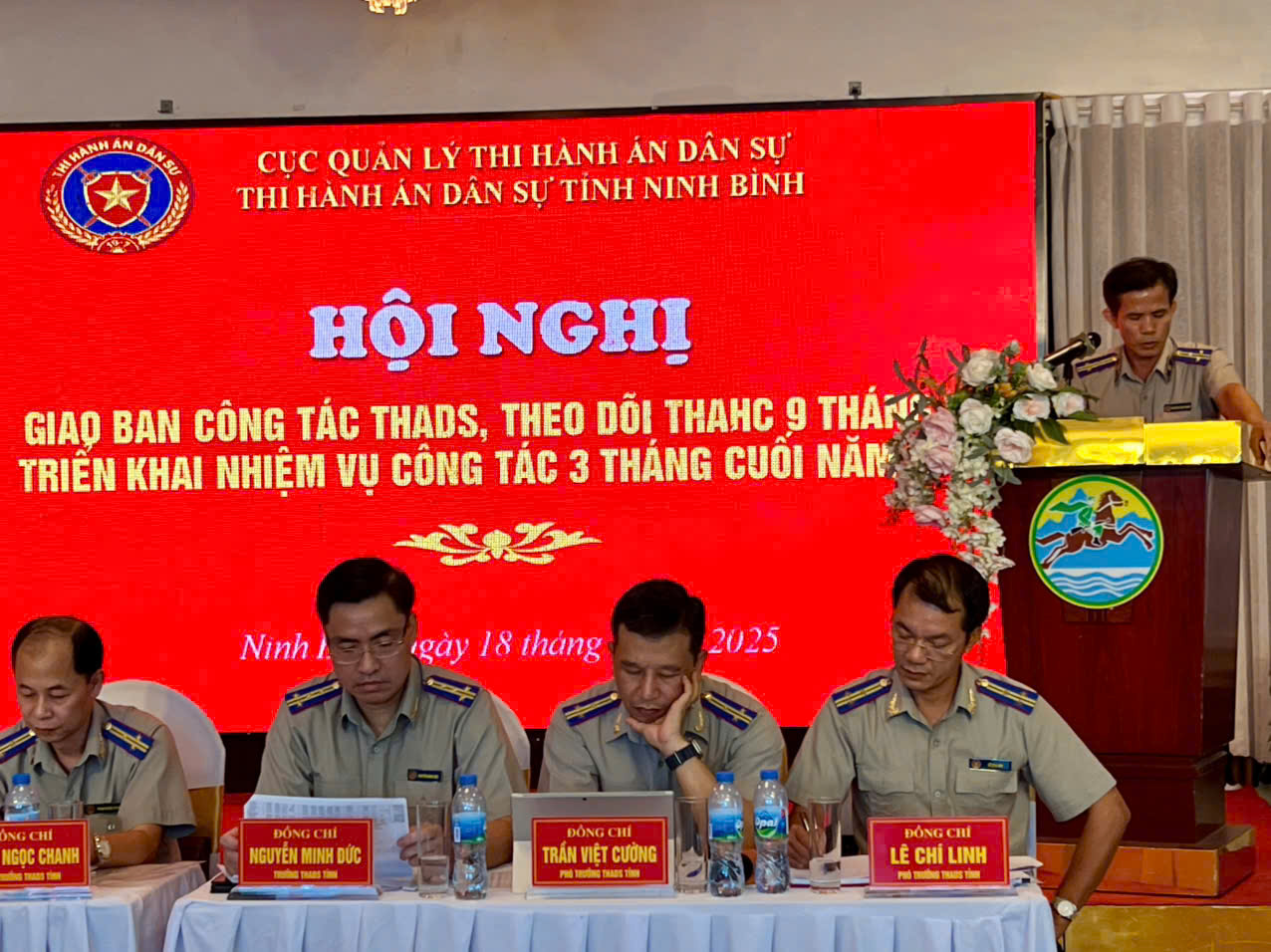 THADS tỉnh Ninh Bình được thành lập theo Quyết định số 1922/QĐ-BTP ngày 25/6/2025 của Bộ Tư pháp trên cơ sở tổ chức lại các cơ quan THADS trên địa bàn tỉnh Ninh Bình, tỉnh Hà Nam và tỉnh Nam Định trước khi sắp xếp. Theo báo cáo tại hội nghị, 9 tháng năm 2025, THADS tỉnh Ninh Bình phải thi hành tổng số 15.918 việc, số tiền 6.168.343.304.000 đồng; kết quả đã thi hành xong 8.939/13.438 việc có điêu kiện, số tiền 1.063.045.408.000 đồng/3.095.607.823.000 đồng có điều kiện thi hành; đạt tỷ lệ 66,52% về việc, 34,34% về tiền (chỉ tiêu trung bình được giao của 3 tỉnh trước sáp nhập là 84,07% về việc, 52,03% về tiền). Ngay sau khi thực hiện sáp nhập, đơn vị khẩn trương thực hiện các thủ tục và được Đảng ủy,UBND tỉnh Ninh Bình thành lập Đảng bộ THADS tỉnh, chỉ định Ban Chấp hành, Ban Thường vụ, UBKT Đảng ủy; Lãnh đạo THADS tỉnh đã sâu sát, quyết liệt trong lãnh đạo, chỉ đạo việc sắp xếp, bố trí trụ sở làm việc, cơ sở vật chất, trang thiết bị, các phương tiện cần thiết đáp ứng yêu cầu nhiệm vụ công tác; phân công, ủy quyền trong tập thể Lãnh đạo THADS tỉnh; nghiên cứu quy định chức năng, nhiệm vụ các phòng chuyên môn, tham mưu, phòng THADS khu vực; nghiên cứu giải quyết các khó khăn, vướng mắc trong thời gian đầu sáp nhập và thực hiện mô hình cơ quan THADS một cấp tại địa phương; giải quyết chế độ, chính sách đối với công chức, người lao động các đơn vị.