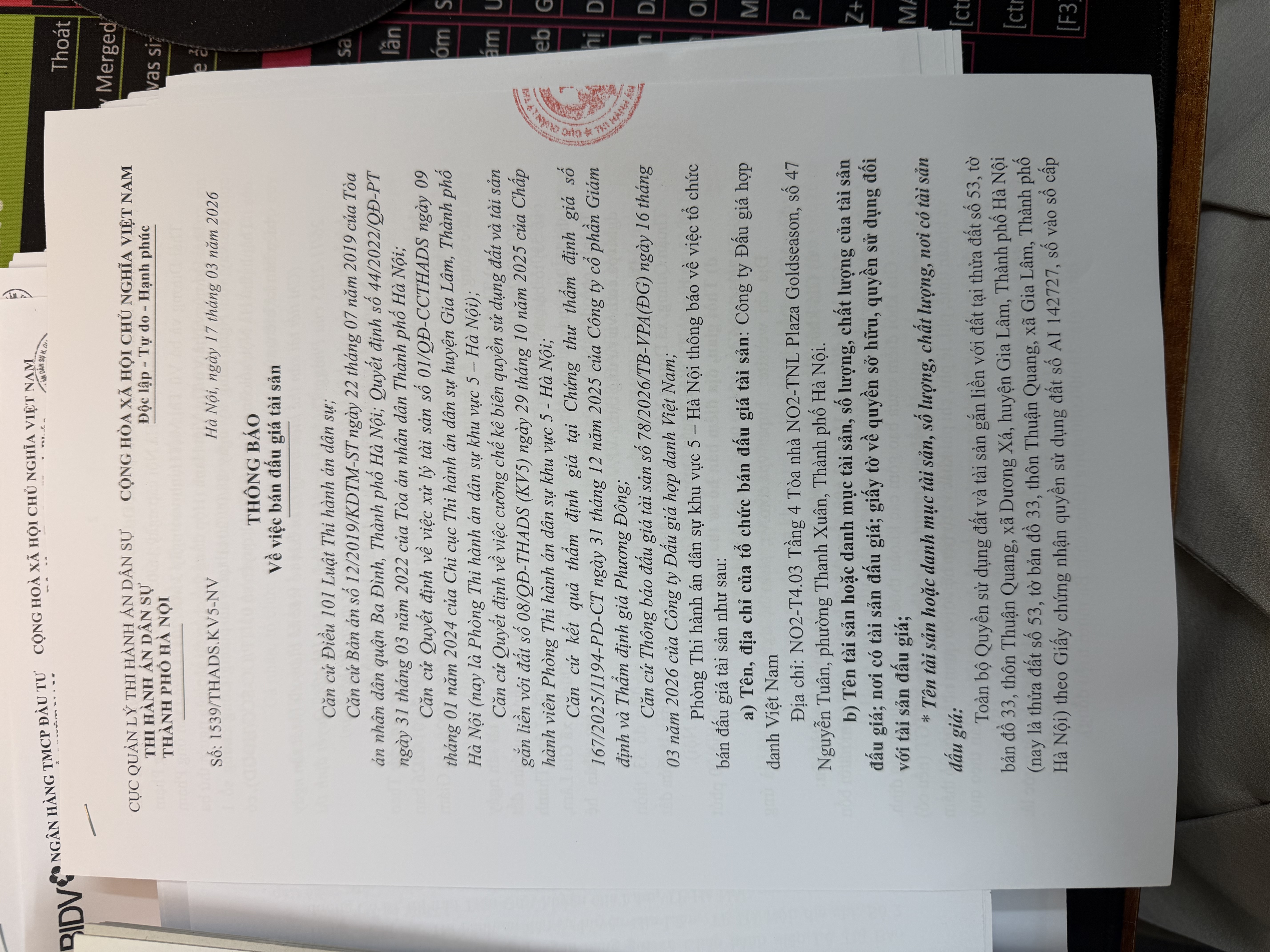 Phòng thi hành án dân sự khu vực 5 - Hà Nội thông báo bán đấu giá tài sản số 1539/THADS.KV5-NV ngày 17/3/2026